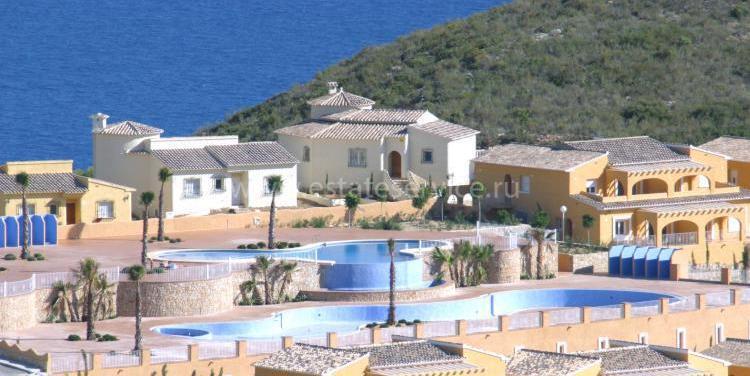 Таунхаус с видом на море в комплексе, расположенном на первой линии пляжа в местечке Кумбре дель Соль на побережье Коста Бланки. Дом, площадью 81 м2, включает в себя 2 спальни, гостиную, кухню, 2 ванные комнаты, террасу. Установлены кондиционеры. На территории комплекса предусмотрен плавательный бассейн с зоной отдыха и парковка.