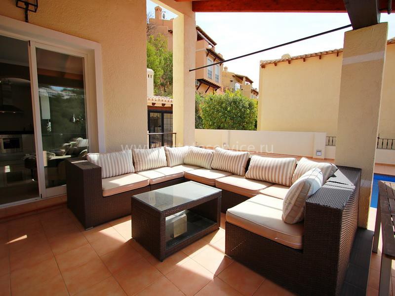 Просторная новая вилла с видом на горы в Альтея Хилс. Площадь дома составляет 210 м2, на первом этаже находятся гостиная 40 м2, спальня-сьют с ванной, столовая 20 м2, оборудованная и меблированная кухня с обеденным столом, прачечная, кладовка и туалет, на втором - две спальни, ванная комната и балкон. Практически новый дом, продается с мебелью и бытовой техникой (микроволновка, холодильник, посудомоечная машина, телевизор). Проведен интернет. Снаружи терраса 120 м2, бассейн, патио, гараж и частный сад, размер участка 450м2, ориентация на юго-запад. Вилла расположена в охраняемой урбанизации с бассейном и общей территорией.
