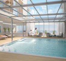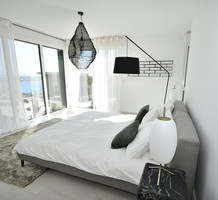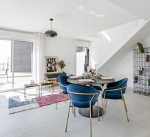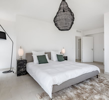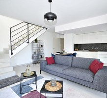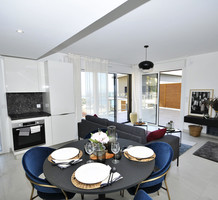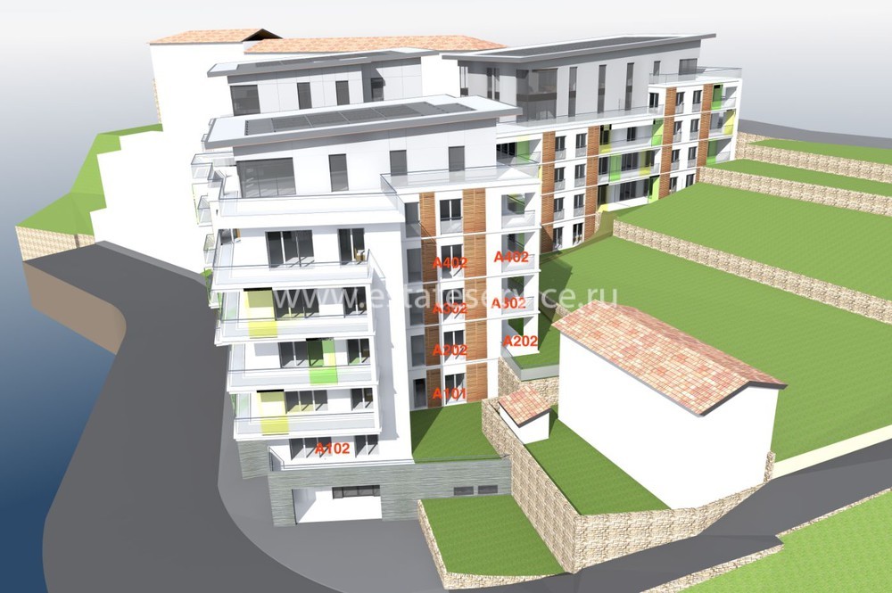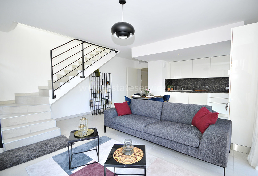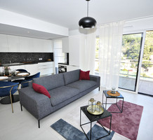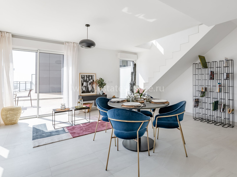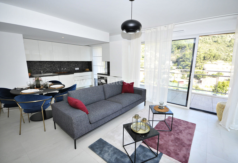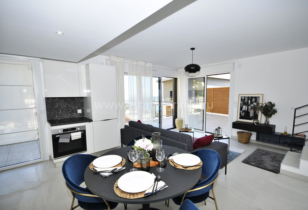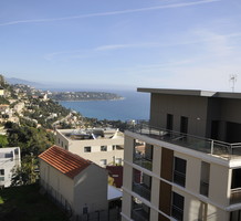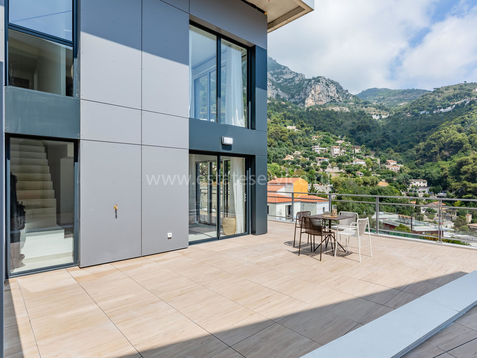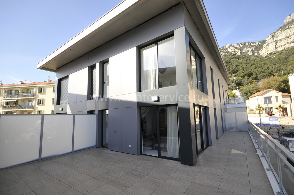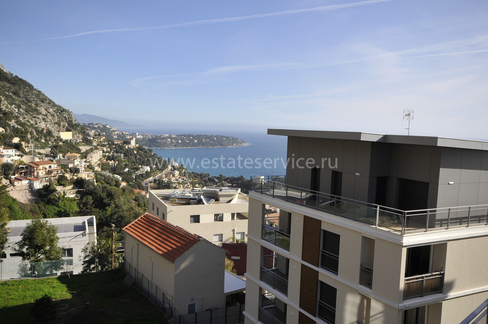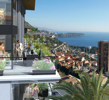 Солидная двухуровневая квартира с панорамой на море, Монако и окрестности. Жилая площадь 103.3 m² - прихожая, ванная комната с туалетом, гостиная с кухонной зоной и выходом на большую террасу 53.76 m² с видом, куда имеет доступ также спальня. Наверху разместились ещё две просторные спальни с гардеробными и ванными комнатами. В цену включены кладовая в подвале и гараж. Современная планировка, высокие потолки, качество строительства и отделки. Резиденция с закрытой территорией и крытым бассейном с подогревом, низкие нотариальные сборы.