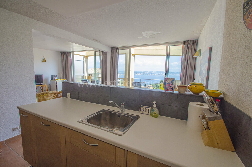 Квартира на верхнем этаже закрытой резиденции с бассейном поблизости от пляжей и центра Théoule-sur-Mer. Жилая площадь 60 m² - прихожая, двойная гостиная-столовая с кухней и выходом на большую террасу 14 m² - панорамный вид на море и Massif de l'Esterel, две спальни и две ванные с душевыми и туалетами. Приличное состояние, включён подземный паркинг на два автомобиля. Резиденция 1992 года постройки, бесплатный трансфер до центра города и пляжей, доступ для людей с ограниченными возможностями, просторный бассейн. Годовой налог 1.063 €.