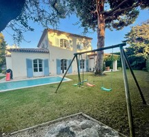 Уютный дом в тихой закрытой резиденции в 5-ти минутах пешком от моря, магазинов и ресторанов. Жилая площадь 207 m², ухоженый земельный участок 704 m² с красивым садом, газоном и бассейном. На первом этаже холл, гостиная-столовая 38 m² с выходом на террасу, большая кухня 18 m², три спальни по 16 m², отдельный туалет и две душевые комнаты. Наверху разместился кабинет 15 m², две спальни 18 и 19 m², главная из которых с ванной комнатой и душевая с туалетом. Есть также прачечная, гараж, гостевой паркинг.