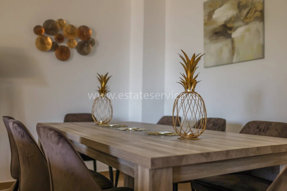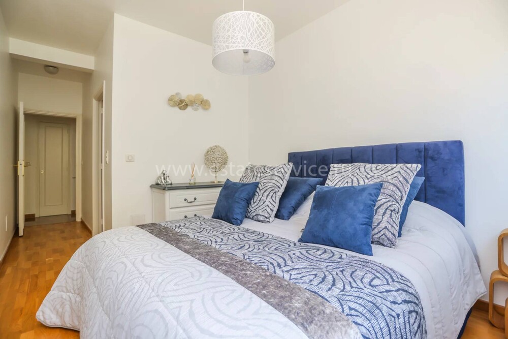 Видовая квартира на втором этаже престижной резиденции с консьержем, садом, бассейном и видеонаблюдением недалеко от центра и пляжей. Жилая площадь 115 m² - прихожая, гостиная-столовая с южной террасой - вид на море, зелень и Леринские острова, отдельная кухня, три спальни с ванными комнатами. Включены закрытый гараж и кладовая. Коммунальные платежи 650 €, годовой налог 2.400 €.