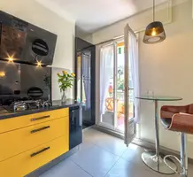 Стильные апартаменты на седьмом (предпоследнем) этаже резиденции с лифтом в 550-ти метрах от моря. Общая площадь 103 m² (жилая 67 m²) - большая прихожая 10 m² с встроенным шкафом, гостиная-столовая 22 m², отдельная кухня 9 m², две спальни 10 и 11 m² - все комнаты выходят на шикарную угловую террасу 36 m² и ванная комната с окном, ванной и туалетом. Престижное и удобное расположение, можно купить (дополнительно) с паркингом и мебелью. Коммунальные платежи 305 €, годовой налог 1.460 €.