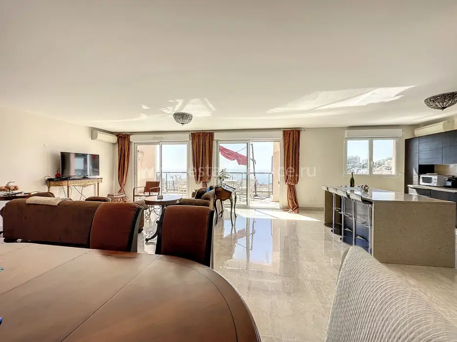 Просторная квартира на шестом (6/7) этаже современной резиденции с бассейном и зелеными насаждениями в секторе Монегетти. Общая площадь 163 m² (жилая 127 m²) - прихожая 4.3 m², двойная гостиная 62 m² с кухней открытого плана и выходом на широкую террасу 36 m², две большие спальни 14.6 и 15 m² с прилегающими ванной и душевой комнатами. Здание 2013 года постройки, отличное состояние, можно оборудовать третью спальню, включены двойной гараж и кладовая. Захватывающие виды на княжество Монако, порт, Le Rocher и Княжеский дворцец.