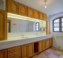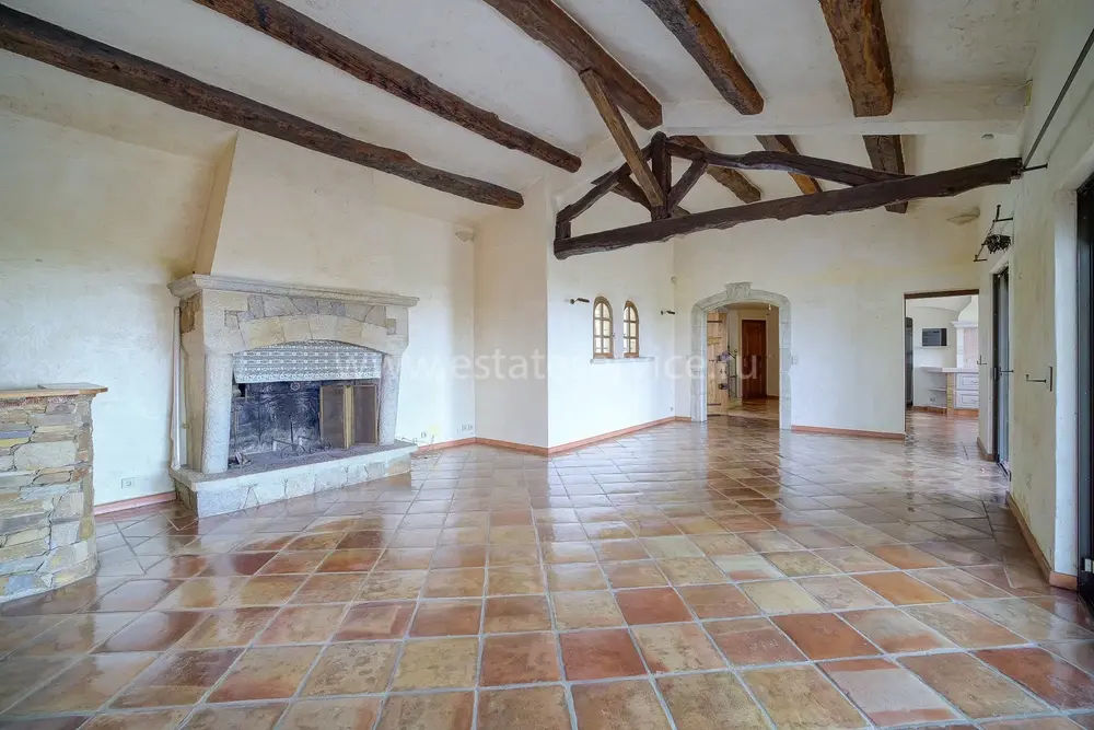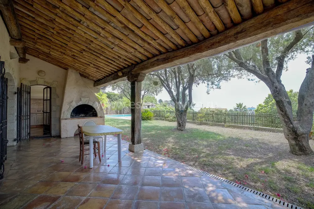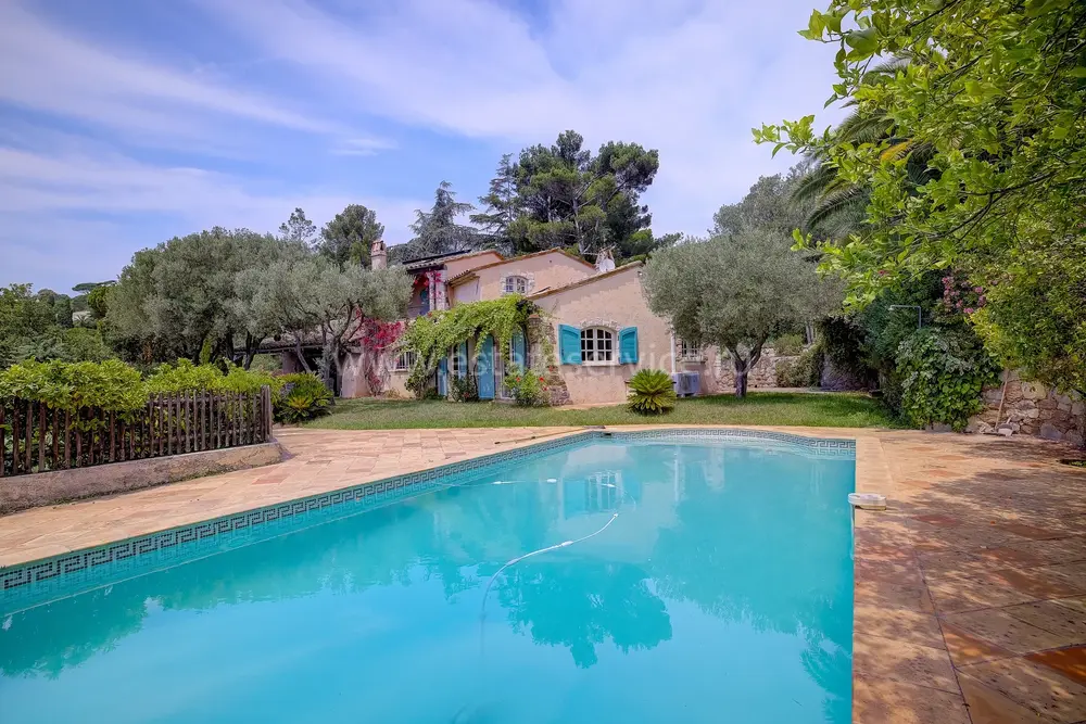 Атмосферная вилла в провансальском стиле с ровным и пышным участком 2.500 m² в 1,5 километрах от побережья и рынка Forville. Жилая площадь 163 m² (получено разрешение на расширение/надстройку - общая площадь до 240 m²), в доме - прихожая 18 m², просторная гостиная 44.8 m² с камином, балочным потолком, высокими окнами и выходом на террасу с видом на море, отдельная кухня 15.6 m² также с видом на море, три большие спальни 12, 12.6 и 17 m² со встроенными шкафами, главная из которых сьют, большая ванная комната с туалетом, гостевой санузел, подсобное помещение, а также большой гараж 150 m² в подвале, прачечная, кладовая и крытая парковка на две машины. На участке много зелени, половина используется под огород, есть большой панорамный бассейн, деревянное шале, которое можно использовать как гостевую студию.