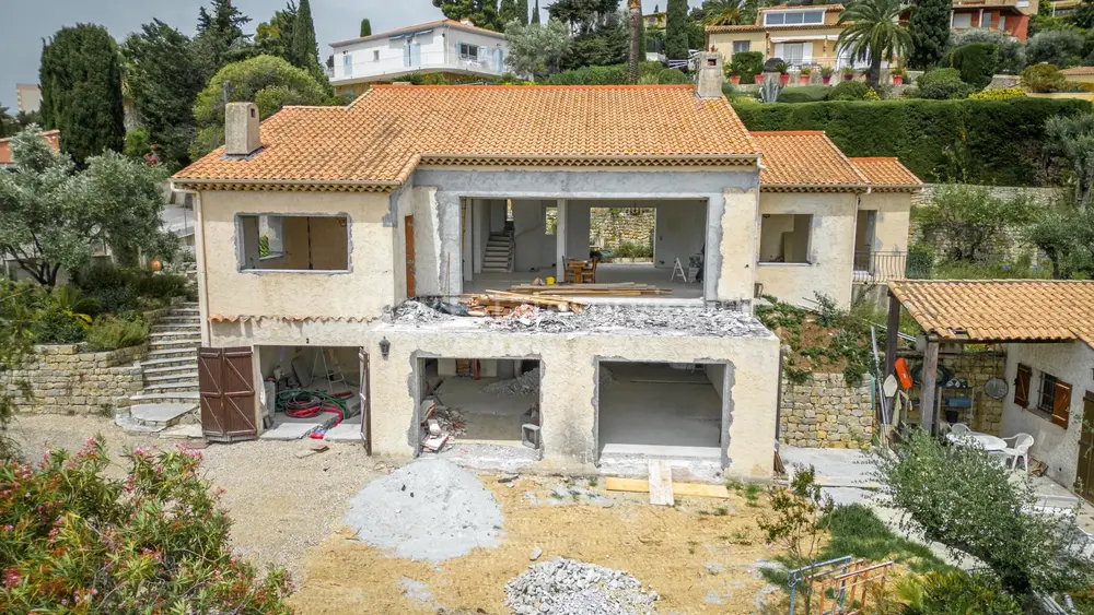 Солидный проект с шикарной морской панорамой в одном из самых престижных районов Retenaou - Brusquets. Общая площадь 423 m² (главная вилла 385 m² + гостевой дом 45 m²), земельный участок 2.034 m² с двумя вьездами и воротами, есть место для плавательного бассейна - подана заявка, ожидающая утверждения. На основном этаже планируется прихожая, большая гостиная более 50 m² с раздвижным окном 6 на 2.8 метра и выходом на первую большую террасу, прилегающая кухня 21 m², главная спальня с открытой гардеробной и ванной комнатой, подсобное помещение и гостевой туалет. Далее разместятся большой кабинет 28 m² с выходом на вторую открытую террасу, спальня с гардеробной и душевой комнатой. На уровне сада ещё три спальни с гардеробными и ванными комнатами, винный погреб, душевая комната с хаммамом, сауной и джакузи, а также дополнительная душевая с подсобным помещением. Есть также гостевой дом 45 m² с отдельным выездом - прихожая, гостиная с кухней, две спальни и ванная комната с туалетом. В настоящее время ведутся ремонтные работы по фасаду и подготовка террасы на крыше. Дом полностью теплоизолирован, будет обновлена электропроводка, полностью заменены коммуникации и сантехника. Действительно большой потенциал, дом продаётся как есть - будущие ремонтные работы в предлагаемую цену не включены. Пока можно внести изменения и выбрать отдельчные материалы, возможно как самостоятельное завершение, так и покупка под ключ с вариантом оплаты по утвержденной смете. Работы продолжаются. Годово налог 2.450 €.