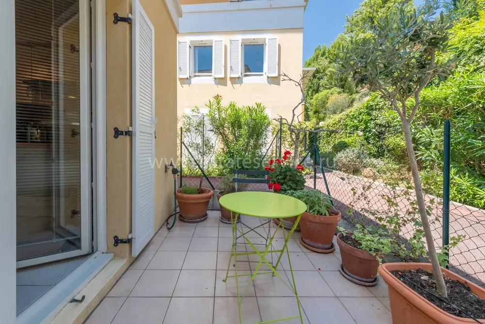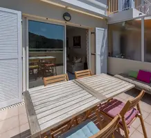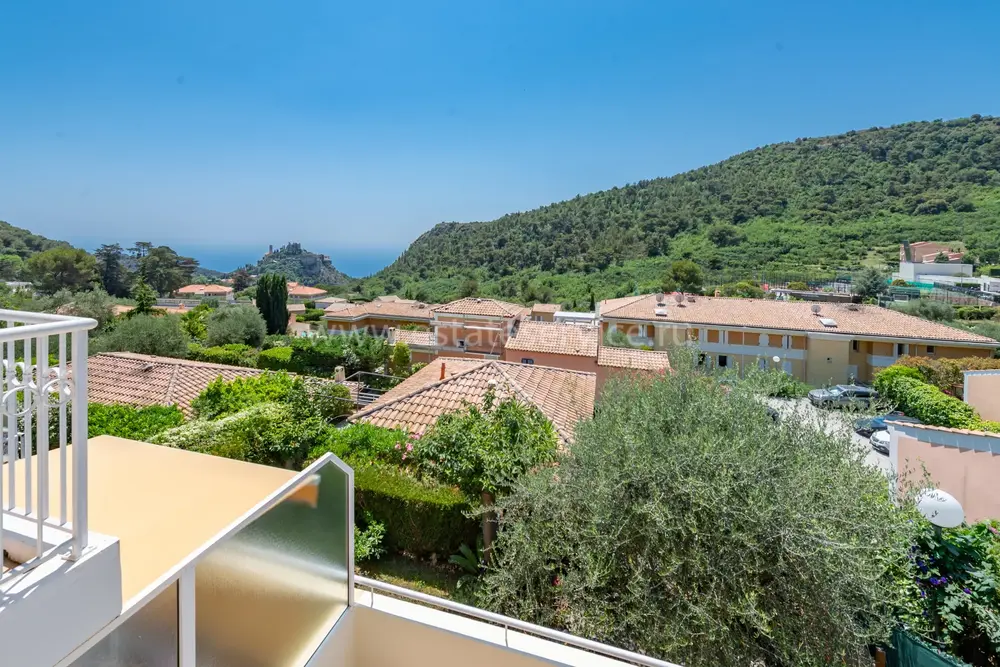 Двухуровневая квартира на втором этаже резиденции с бассейном поблизости от поселка Eze village. Общая площадь 91.7 m² (жилая 71.5 m²) - прихожая, гостиная 24 m² выходящая на большую террасу 11.8 m² с видом на море, отдельная кухня 8.2 m² со второй террасой 8.3 m² и туалет. Наверху разместились две спальни 11.9 и 12. 5 m² с душевой комнатой и туалетом. Отличное состояние, включён большой гараж. Коммунальные платежи 200 €.