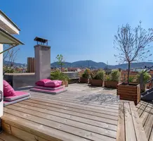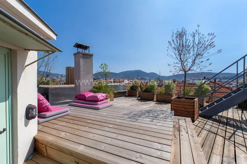 Нетипичный дуплекс с новым ремонтом на верхнем этаже красивого здания Art Déco по улице Верди. Общая площадь 104.5 m² (жилая 82 m²), на первом уровне (седьмой этаж) большая гостиная 42 m² с удобной открытой кухней, большими эркерными окнами, и выходом на первую террасу 40 m² с доминирующим видом на город, кабинет с гардеробной, прачечная, главная спальня 16.2 m² с несколькими окнами и большой ванной комнатой комнатой. Наверху разместилась вторая светлая спальня 16.5 m² оформленная в виде ротонды, с кондиционером, встроенной ванной и панорамным видом. С обеих террас есть доступ на крышу здания, преобразованную в частную террасу 250 m² с шикарным 360° видом на Ниццу, Negresco, море и окрестности. Отличное состояние, установлены солнечные батареи, электрические жалюзи, поблизости есть паркинг. Отремонтированное здание с лифтом и домофоном в 650-ти метрах от Английской набережной, моря и пляжа. Коммунальные платежи 325 €, годовой налог 1.411 €.