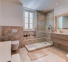 Пятикомнатная квартира на верхнем (7-м) этаже буржуазного здания с лифтом и видеонаблюдением в 10-ти минутах от моря. Жилая площадь 135 m² - прихожая, светлая и просторная гостиная более 45 m², отдельная кухня, главная спальня-люкс со своей ванной, санузлом и кабинетом, ещё две спальни, огромная ванная комната с окном, душевой и подвесным туалетом, а также две небольшие террасы по обеим сторонам - красивые виды на крыши города, холмы Mont Boron, Mont Alban и Mont Chauve. Новый ремонт, высокие потолки, тройная экспозиция (юг, запад, восток), кондиционеры. Коммунальные платежи 165 €, годовой налог 1.830 €.