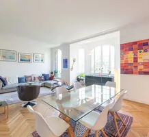 Отремонтированная квартира на пятом (5/6) этаже здания Belle Epoque с лифтом напротив парка Alsace Lorraine и в 5 минутах от Английской набережной и моря. Жилая площадь 112 m² - светлая прихожая 8.6 m² с гардеробной, двойная гостиная 35 m² с большими окнами - вид на парк и зелень вдоль бульвара Виктора Гюго, отдельная кухня 8.7 m² с балконом, две большие спальни 17.5 и 22.8 m², одна из которых со своей ванной, душевая комната и отдельный туалет. Свежий ремонт, высокие потолки (3 метра), прилагается кладовая в подвале. Коммунальные платежи 283 €, годовой налог 1.805 €.
