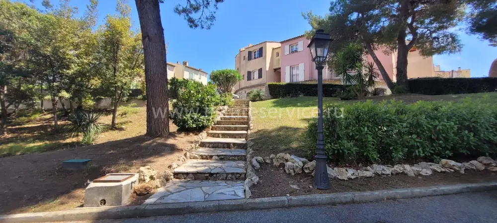 Смежная вилла в центре тихого и уютного посёлка с консьержем в 7-ми минутах от моря и 500-х метрах от магазина. Жилая площадь 100 m² прихожая с подсобным помещением, гардеробной и выходом в двойной (продольный) гараж, кухня выходит в столовую и гостиную с камином, откуда есть доступ на террасу и сад 70 m². Наверху разместились три просторные спальни с наклонными потолками, ванная комната и душевая. Отличное состояние, несколько террас, в том числе с видом на море. Коммунальные платежи 100 €.