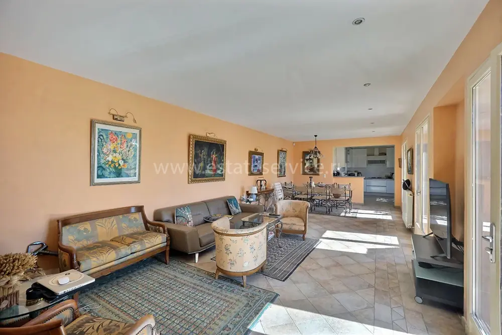 Атмосферная вилла с красивой панорамой в двух километрах от моря, сектор Pertuades. Жилая площадь 146 m², прилегающий участок 919 m². На первом уровне прихожая, кухня и гостиная выходящие на большую террасу, спальня, ванная комната и туалет. Наверху разместились ещё три спальни, одна из которых с ванной комнатой и отдельная ванная комната с туалетом. Хорошее состояние, отдельный гостевой домик-студия с террасой и выходом к бассейну, есть также два парковочных места.