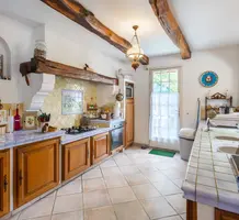 Тихая вилла провансальской стилистики в 20-ти минутах езды от моря. Общая площадь 210 m² (жилая 174 m² + подвальный гараж 36.2 m² с подсобным помещением и погребом), участок земли 2.000 m² с красивым садом, большой террасой 100 m² с летней кухней/дровяной печью и паркингом. На первом уровне - прихожая, гостиная-столовая 53 m², отдельная кухня 17 m² с выходом на террасу 30 m², две спальни 17 и 21 m², ванная комната, два отдельных туалета и несколько кладовых. Наверху разместились ещё две спальни 19 и 24.6 m² с балконом 5.8 m², ванная комната, душевая с туалетом и гардеробная. Годовой налог 3.347 €.