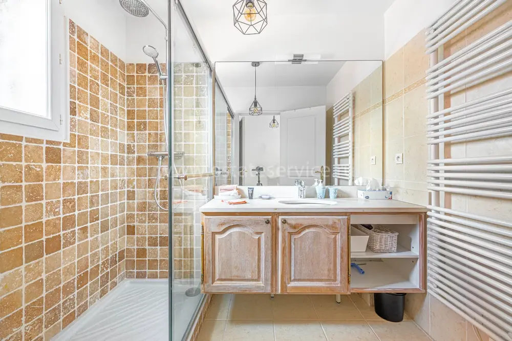 Ухоженный дом в резиденции на десять владельцев в престижном секторе в 15 минутах от моря - Вогренье. Общая площадь 188 m² (жилая 154.5 m² + терраса 19 m² и гараж 15 m²) - прихожая 5 m², двойная гостиная 19.8 m², отдельная кухня 10.4 m², три спальни 8, 14.9 и 25 m² (главную наверху можно разделить на две, сделав дополнительную спальню), а также функциональная пристройка-апартаменты 26 m² для размещения гостей или персонала. Хорошее состояние, двойное остекление, реверсивный кондиционер, приятная панорама на море и окрестности, ухоженный сад с бассейном. Коммунальные платежи 200 €, годовой налог на имущество 1.900 €.