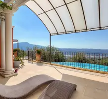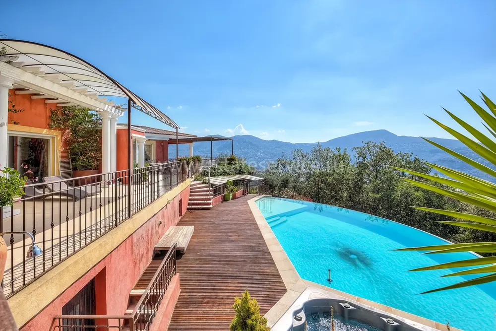 Элегантная вилла с доминирующим расположением и красивой панорамой на горы и окрестности. Жилая площадь 226.5 m², террасный участок 2.700 m². В доме - прихожая, просторная гостиная-столовая 100 m² с камином, открытой кухней островного типа и выходом на террасу, три спальни-люкс с ванной комнатой, туалетом, кладовой и гардеробной, отдельный санузел, а также двухкомнатная квартира 60 m² с отдельным входом (есть доступ также через дом с выходом в сад) идеально подходящая для приема гостей. Приличное состояние, установлены солнечные батареи, подсобная пристройка, два больших гаража и кладовые. Годовой налог 2.698 €.