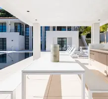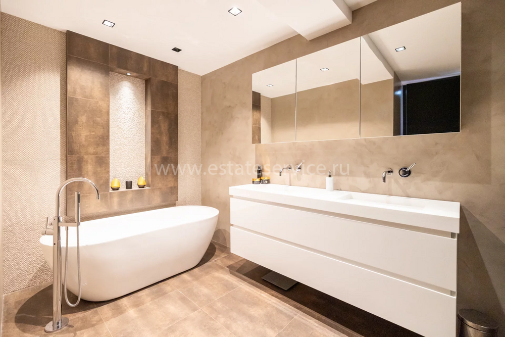 Солидная вилла 2014 года постройки в центре зелёного и престижного квартала Мон Борон. Общая площадь 294 m² (жилая 234 m²), ландшафтный участок 1.700 m² с бассейном, крытой зоной отдыха с летней кухней, гаражом и паркингом. На основном уровне разместилась главная прихожая, шикарная тройная гостиная 89 m² с островной кухней и крытой террасой с выходом к бассейну, кабинет 22 m² с собственной террасой - вид на море из всех комнат и прачечная. Ниже разместились спальня владельцев 16.6 m² с гардеробной, ещё три спальни 10.8, 16.2 и 16.8 m² и сьют - весь этаж выходит на большую террасу с крытой летней кухней и подвал. Годовой налог на имущество 5.359 €.
