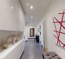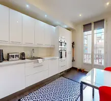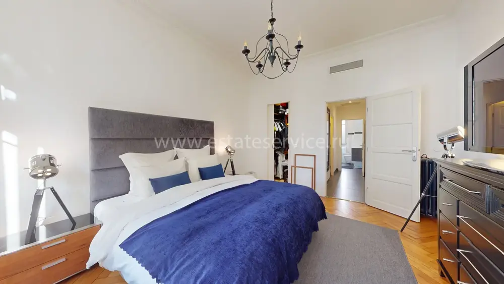 Ухоженные буржуазные апартаменты возле Торгового центра Nice TNL и сквера-парка Jardin Bachaga Boualem. Общая площадь квартиры 109.1 m² (жилая 102.9 m²) - прихожая 15 m² ведущая ко всем комнатам, столовая 15.8 m² с балконом 3.25 m² и примыкающей гостиной 15 m², отдельная кухня 11.7 m² со вторым балконом 2.9 m² на внутренний двор, две большие спальни 14.3 и 18 m², гардеробная и ванная комната 8 m² с ванной, душем и туалетом. Хорошее состояние, высокие потолки, паркет, легко оборудовать дополнительную спальню. Коммунальные платежи 110 €, годовой налог 1.444 €.