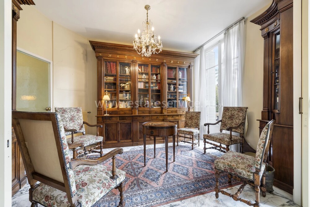 Действительно просторная квартира в престижном Belle Epoque здании в центре Ниццы. Общая площадь 233 m² (жилая 198 m²), на первом уровне прихожая 7.6 m², солидная гостиная-столовая 49.6 m² с высоким потолком 4.5 метра и прямым видом на парк, отдельная кухня 10.2 m² и две спальни 10.5 и 11 m² на внутренний двор, кабинет, ванная комната и туалет. Наверху разместились ещё три спальни 10.5-11 m², вторая гостиная, ванная комната, туалет и несколько гардеробных. Все удобства пешком! Включены подсобная комната 15 m² свободного назначения и большая кладовая 11.4 m² в подвале. Коммунальные платежи 280 €, годовой налог 2.763 €.