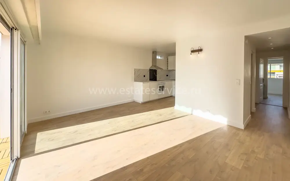 Квартира на верхнем (6-м) этаже здания с лифтом в 15-ти минутах ходьбы от знаменитой улицы Антиб. Общая площадь 60.0 m² (жилая 49.07 m²) - гостиная 25.4 m² с новой кухней и выходом на просторную террасу 14.5 m² для семейных завтраков, главная спальня 17.6 m² с встроенной по индивидуальному заказу гардеробной, детская спальня/кабинет 6 m², душевая и отдельный туалет. Коммунальные платежи 735 € за квартал.