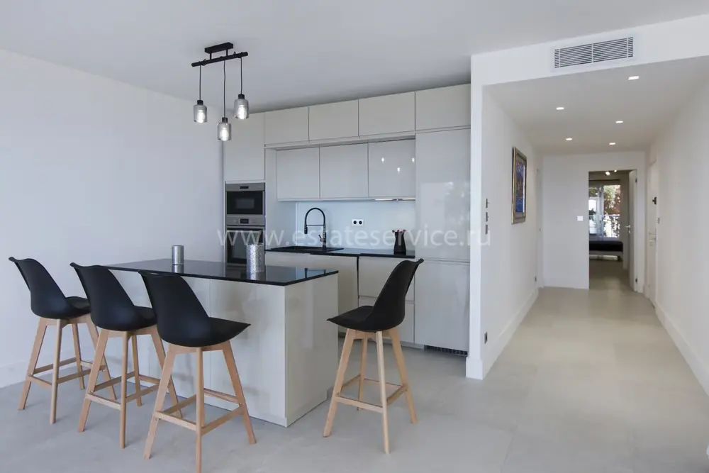 Квартира в престижной резиденции с ландшафтным парком, двумя бассейнами, теннисным кортом, ресепшеном и круглосуточным видеонаблюдением. Общая площадь 120 m² (жилая 109.8 m² + лоджия 10 m²) - прихожая, гостиная-столовая с островной кухней и двойной террасой 18.1 m² - вид на море, зелень и Леринские острова, две большие спальни, каждая со своей душевой комнатой и гардеробной, прачечная и отдельный санузел. Шикарная отделка, можно оборудовать третью спальню, включены кладовая и двойное парковочное место в подвале. Коммунальные платежи 700 €, годовой налог 2.174 €.