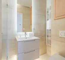 Квартира с новым ремонтом на верхнем этаже небольшого кондоминиума с лифтом в 850-ти метрах от Дворца фестивалей. Общая площадь 67 m² (жилая 64 m²) - прихожая 1.7 m², светлая гостиная-столовая 33.6 m² с встроенной кухней и балконом 3 m², главная спальня 12.3 m² с гардеробной, детская/кабинет 6.9 m² и две душевые комнаты с туалетами. Качественная отделка и материалы, включён крытый паркинг в соседнем здании. Коммунальные платежи 125 €, годовой налог 903 €.