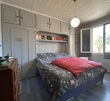 Жилая площадь 64.11 m² - светлая и просторная гостиная 28.3 m², кухня 9.9 m² с выходом на мощеную террасу с уединённым садом и примыкающим сараем, две уютные спальни 5.7 и 12.4 m², душевая комната, туалет и кладовая. Приличное состояние, продаётся с мебелью, установлен кондиционер, есть частное парковочное место. Коммунальные платежи 70 €, годовой налог 645 €.
