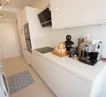 Ухоженные апартаменты на 8-м (предпоследнем) этаже здания с лифтом в центре города и 500-х метрах от моря. Жилая площадь 53 m² - светлая двойная гостиная, кухня с окном-перегородкой и балконом 9.1 m², спальня с примыкающей душевой и отдельный туалет. Свежий ремонт, включена кладовая, рядом можно арендовать гараж -- квартира готова к заселению. Коммунальные платежи 140 € включают холодную воду, отопление и обслуживание общих частей кондоминиума.