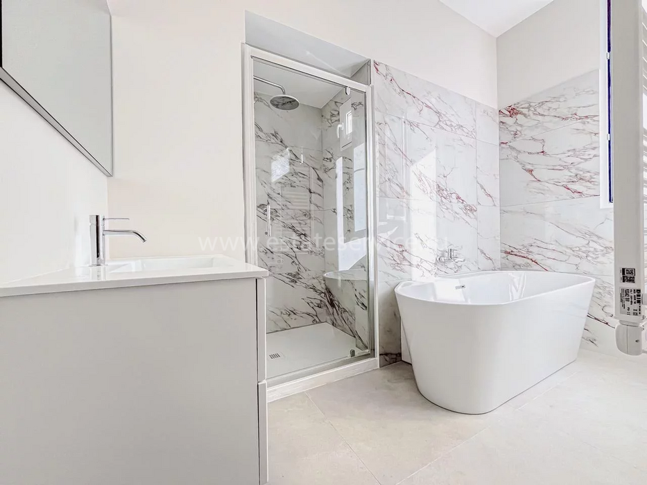 Полностью отремонтированная смежная вилла на тихой тупиковой (закрыта от въезда) улице в пяти минутах ходьбы от моря. Общая площадь 145 m² (жилая 135 m²), первый и нижний этажи представляют собой отдельные блоки - подходит для гостей или сдачи в аренду. На основном уровне (высота потолков 3.25 м) - прихожая 5 m², гостиная-столовая 21 m² с открытой кухней и большими французскими дверями, выходящими на террасу 35 m² и в сад, гостевой туалет, ванная комната с душем + островной ванной и лестница. Наверху (высота потолков 2,77 м) разместились три спальни 7.7, 9.4 и 12.7 m², одна - с балконом, две с большими встроенными шкафами под заказ, и душевая комната с туалетом. На уровне сада (нижний этаж) - отдельные трёхкомнатные апартаменты 45 m² - гостиная 24.8 m² с открытой кухней и выходом на просторную террасу 33 m, две спальни 6.4 и 9.3 m² и душевая комната с туалетом. Качественная отделка и материалы, два парковочных места перед домом. Годовой налог на имущество 1.490 €.