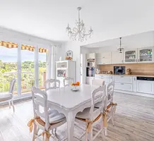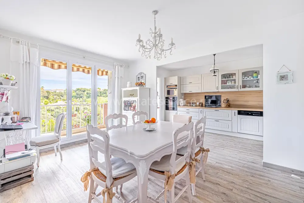 Апартаменты на первом приподнятом этаже закрытой ухоженной резиденции в 4-х километрах (ходит автобус) от моря, квартал Saint Philippe. Жилая площадь 80 m² - прихожая 4.9 m², двойная гостиная 33.4 m² с встроенной кухней, первой террасой 37.5 m² и очаровательным частным садом 42 m² - есть небольшой проблеск моря, две спальни 11 и 11.3 m² со второй террасой на запад, ванная комната, душевая и отдельный туалет. Хорошее состояние, включён закрытый гараж и кладовая. Коммунальные платежи 129 €, годовой налог 1.213 €.
