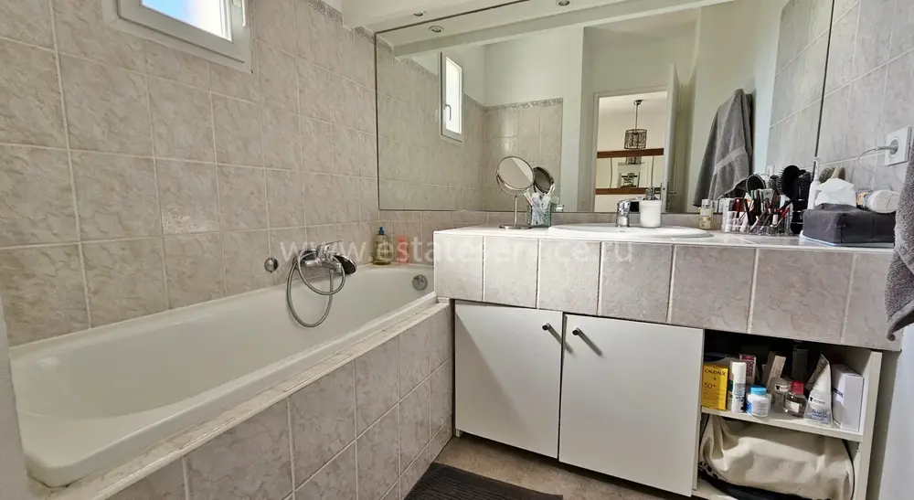 Смежная вилла в безопасном кондоминиуме поблизости от школ и деревни, сектор Pierrefeu. Площадь дома 116 m², на первом этаже холл, просторная гостиная 46.7 m² с камином, зоной столовой и выходом на террасу 60 m² и в сад 150 m², куда также имеет доступ отдельная кухня 6.7 m² и гараж. Наверху главная спальня 10 m² с ванной комнатой, гардеробная, ещё две спальни 10.5 и 15.9 m², балкон, ванная комната и туалет. Отличное состояние, газовой отопление, всё рядом. Коммунальные платежи за квартал 400 €, годовой налог на имущество 1.000 €.