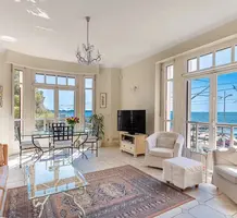 Светлые апартаменты на втором этаже закрытой буржуазной резиденции в нескольких шагах от пляжа. Площадь квартиры 114 m² - прихожая 12 m², двойная гостиная-столовая 22 m² с открытой кухней 27 m² и фр. балкончиками, две большие спальни по 15 m² с видом на море, ванная комната с туалетом, душевая с сауной/хаммамом и отдельный туалет. Высокие потолки, есть подсобное помещение 11 m² в подвале, поблизости большая бесплатная парковка, все удобства пешком. Коммунальные платежи 201 €, годовой налог 1.447 €.