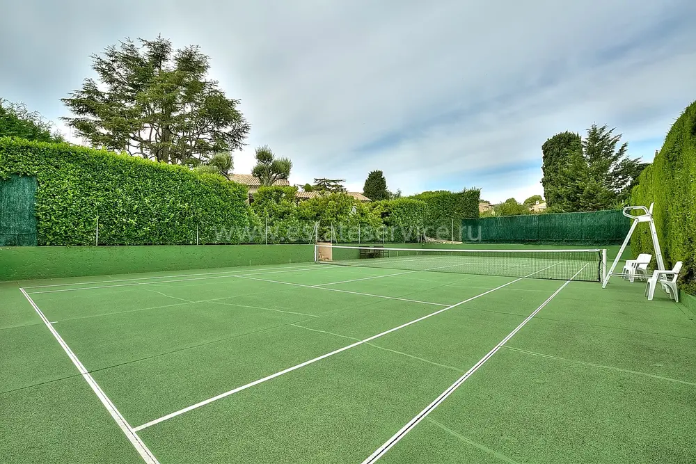 Солидное владение в тихом престижном секторе недалеко от Международной школы Мужена. Общая площадь виллы 495 m² (жилая 350 m²), прилегающий земельный участок 2.430 m². На трёх уровнях разместились большая прихожая, просторная гостиная с высоким потолком и мезонином, отдельная кухня, четыре спальни с ванными комнатами, кабинет, гостевая студия, двухкомнатные апартаменты с ванной и отдельным входом, помещение свободного назначения с игровой зоной/бильярдной, тренажерный зал, массажный кабинет и сауна, а также гараж, множество террас и летняя кухня со столовой. Годовой налог на имущество 4.500 €.