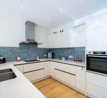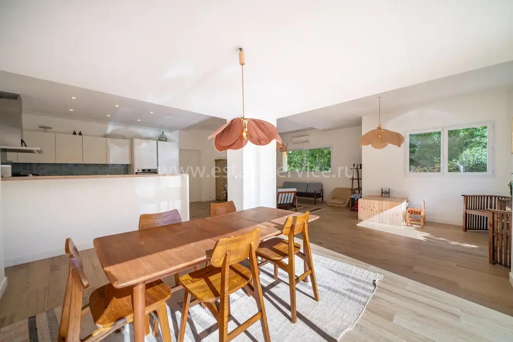 Недавно отремонтированная смежная вилла с удобным расположением в 10-ти минутах от моря. Общая площадь дома 206 m² (жилая 165 m²), на участке 400 m² небольшой сад с автополивом, бассейн с подогревом и разводной тиковой террасой, отдельный гараж и крытая парковка. На первом уровне прихожая 7.4 m², тройная гостиная 60 m² с открытой кухней, столовой 21.7 m² и выходом на террасу, главная спальня 21.6 m² с гардеробной и душевой комнатой, а также гостевой туалет. На втором - ещё три спальни 10.9, 11.9 и 12.5 m², одна из которых с большой террасой, и общая ванная с туалетом. Отличное состояние, есть кладовая 9.4 m² и прачечная 10.2 m² в подвале. Годовой налог 2.255 €.
