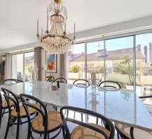 Квартира расположенная на трёх верхних этажах ухоженного здания в 300-х метрах от моря. Общая площадь 226 m² (жилая 128 m²), на первом уровне (6-й этаж с доступом на лифте) - светлая и просторная гостиная-столовая 52 m² с открытой кухней и выходом на две террасы (на юг и север) по 11 m², кабинет/гостевая спальня 9 m², прачечная, душевая и туалет. Далее разместились две спальни 10 и 19 m², главная с душем и раковиной, общая ванная комната, туалет и две террасы 12 и 20 m². Наверху - четвёртая спальня 14 m² со своей кухней, душевой и частной террасой 43 m² с джакузи и летней кухней с барбекю. Отличное состояние, приятный вид на окружающие крыши и холмы. Коммунальные платежи за квартал 1.260 €, годовой налог 2.157 €.