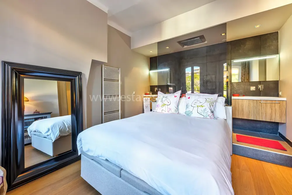 Апартаменты с видом, ремонтом и гаражом в престижном дворце (отреставрированное здание отеля Наполеон III) с парком в 350-ти метрах от пляжа. Жилая площадь 108 m² - широкая прихожая-холл 14 m², гостиная 31.2 m² с панорамным балконом 5 m², отдельная кухня 14 m² островного типа, две большие спальни 14.7 и 17.5 m², одна с душевой, другая с балконом, гидромассажной ванной, гардеробной и туалетом. Современный стиль в сочетании с очарованием старины (высокие потолки, большие окна, камины, центральный кондиционер), квартира готова к заселению, включён большой гараж Четвёртый этаж закрытой резиденции с лифтом, видеонаблюдением и парковкой для посетителей. Коммунальные платежи 235 €, годовой налог 1.700 €.