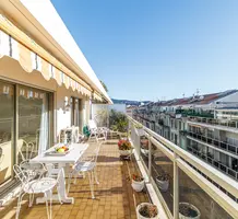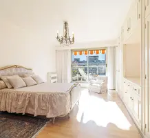 Квартира с потенциалом на 7-м (предпоследнем) этаже престижной резиденции с консьержем в центре Ниццы. Общая площадь 144.8 m² (жилая 110.7 m²) - прихожая 11.9 m² с гардеробной, гостиная 29 m² с широкой террасой 27 m², отдельная кухня 9.9 m² с балконом 7 m², три спальни 8.7, 13.8 и 19.9 m² - две также выходят на балкон, ванная комната с туалетом, душевая и отдельный санузел. Потребуется обновление.