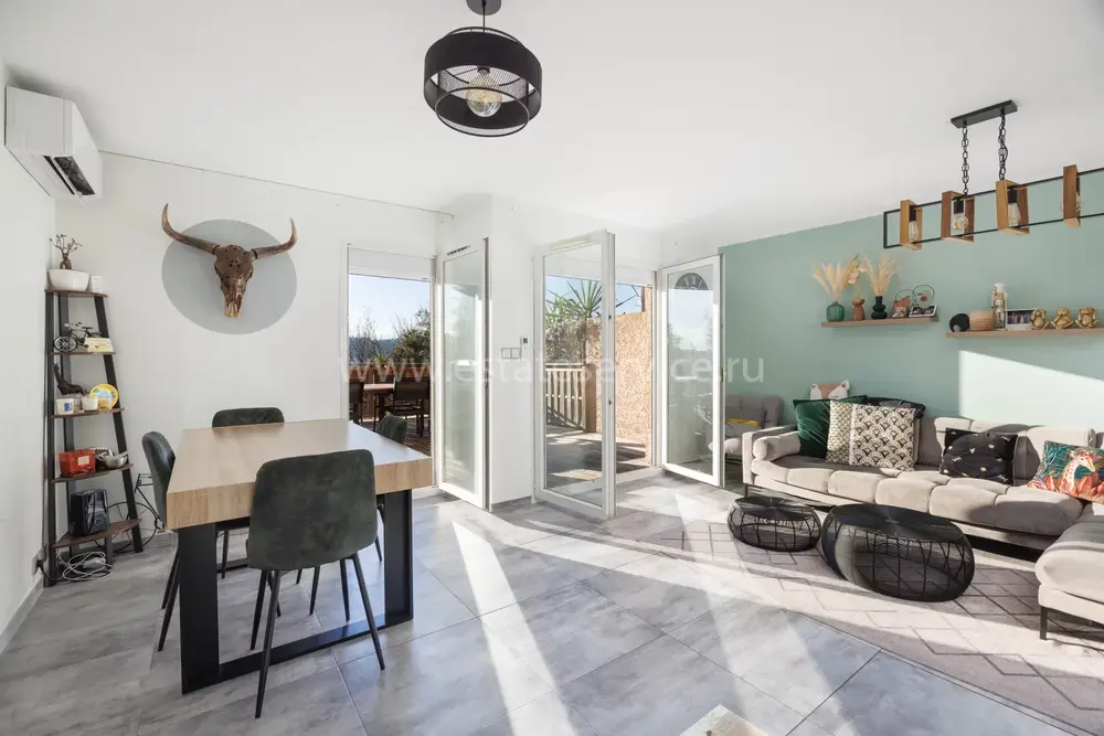 Стильный трёхуровневый таунхаус с приятной панорамой на море, горы и окрестности. Жилая площадь 96 m² + гараж 14 m² с прямым доступом, в доме - прихожая, светлая гостиная 27 m², выходящая на большую террасу 28 m² с патио, отдельная кухня 11 m², четыре спальни, душевая с туалетом, ванная комната и отдельный санузел. Отменное состояние, электрические жалюзи, наружное освещение, домофон, всего 6 км от аэропорта. Коммунальные платежи 94 €, годовой налог 1.960 €.