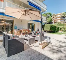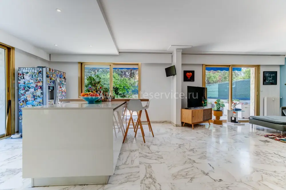 Уютные апартаменты в тихой безопасной резиденции, сектор между Симье и Rimiez. Жилая площадь квартиры 108.8 m² - прихожая, просторная гостиная 51.4 m² с островной кухней, выходом на большую террасу и очаровательный сад 388 m² с личным бассейном, две спальни 11.6 и 11.9 m², главная с душевой/туалетом, детская спальня/кабинет 8.6 m², общая ванная комната и отдельный туалет. Очень приличное состояние, включены закрытый гараж 14.6 m² и кладовая. Коммунальные платежи 450 €, годовой налог 2.526 €.