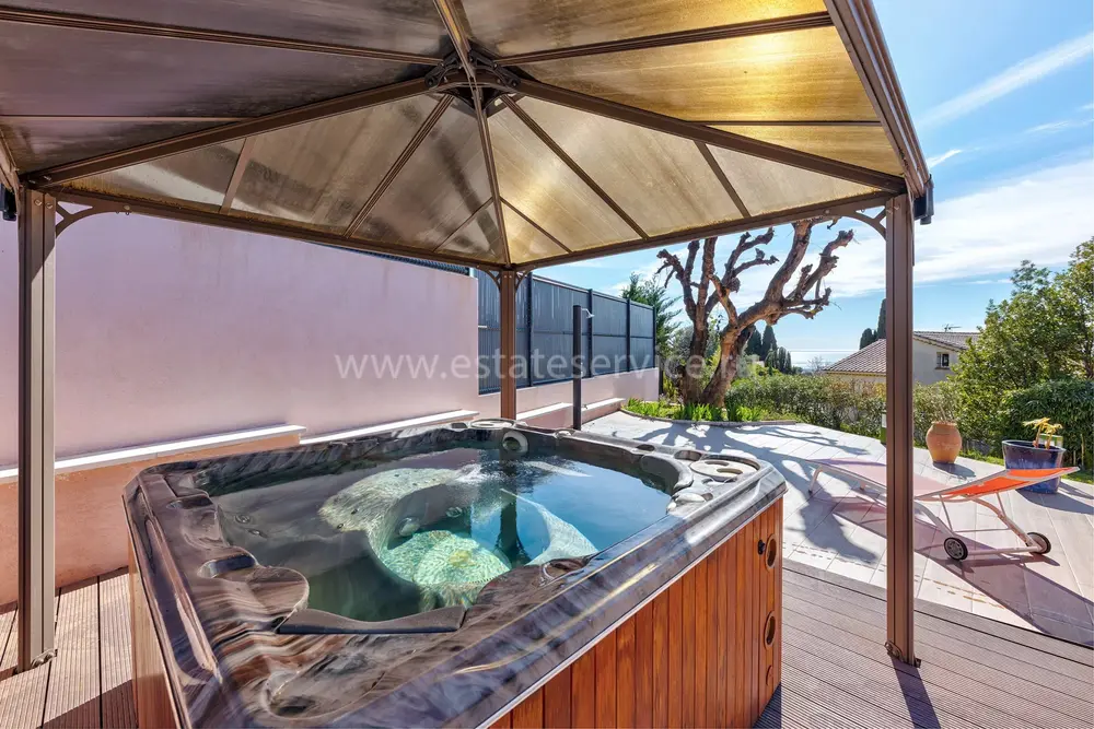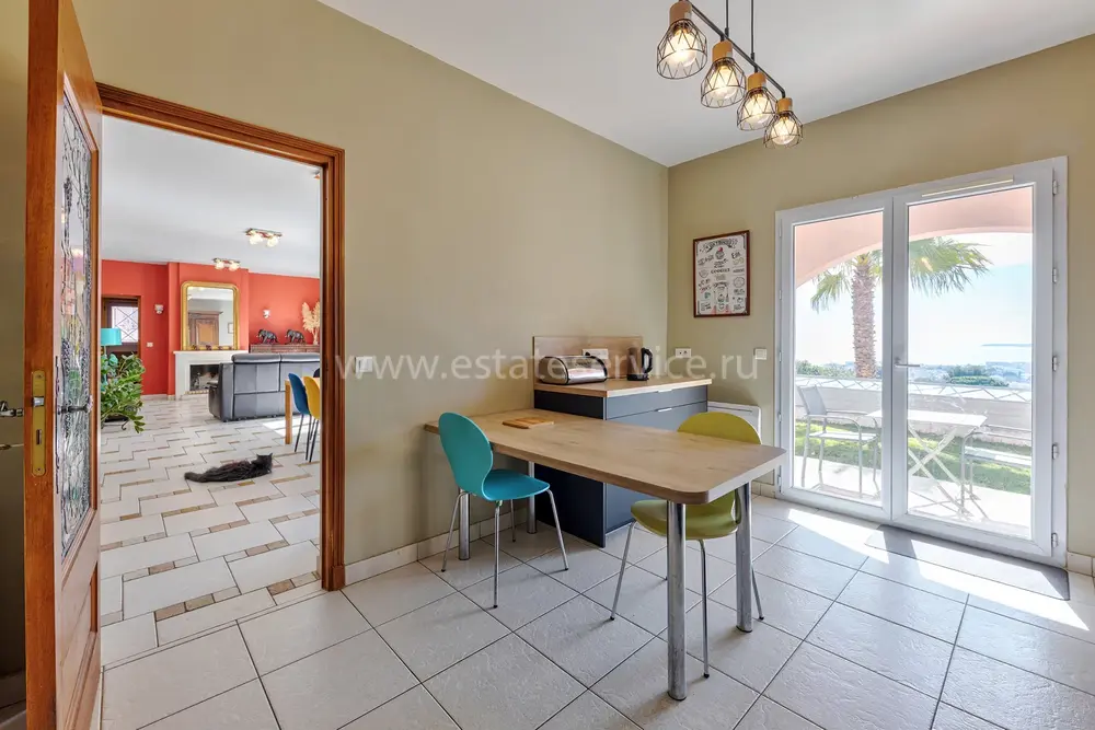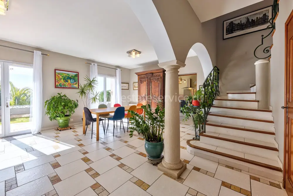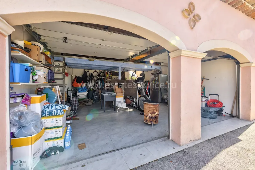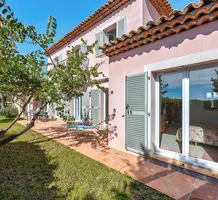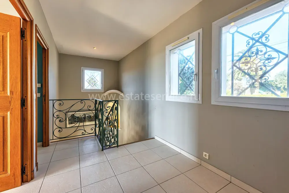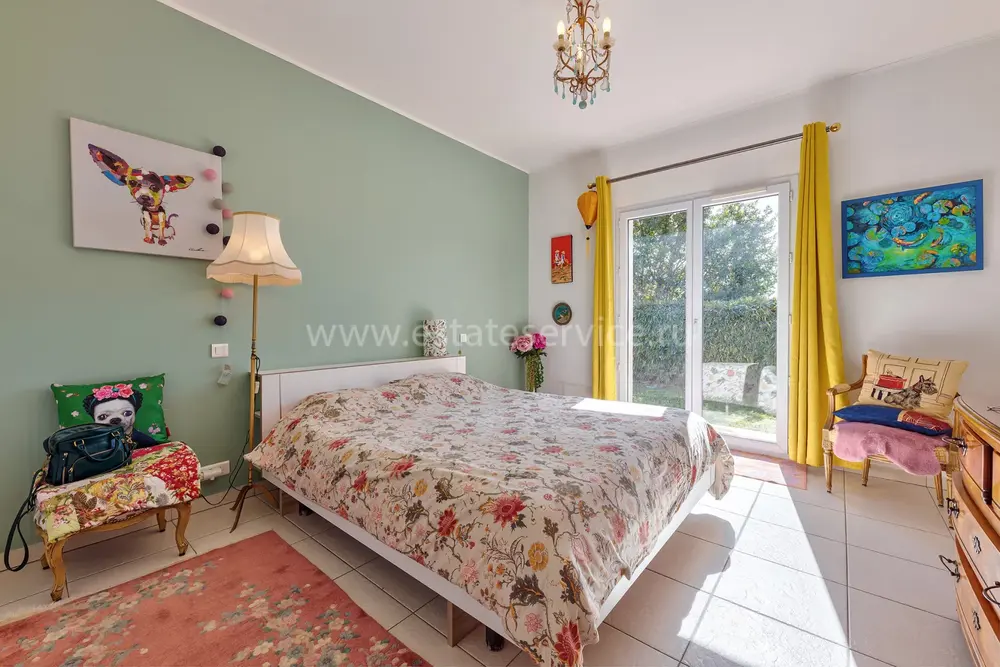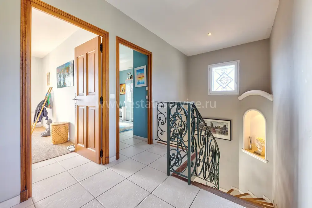 Ухоженная вилла 2005 года постройки в тихом популярном районе Ле-Колетт. Жилая площадь 196 m² + гараж на две машины, на участке 1.020 m² пышный ландшафтный сад, крытое джакузи. На первом этаже прихожая, гостиная, столовая, кухня, спальня, кабинет, ванная комната с туалетом, кладовая и санузел. Наверху - ещё три спальни, одна с балконом, игровая комната, ванная и отдельный туалет. Годовой налог 2.009 €.