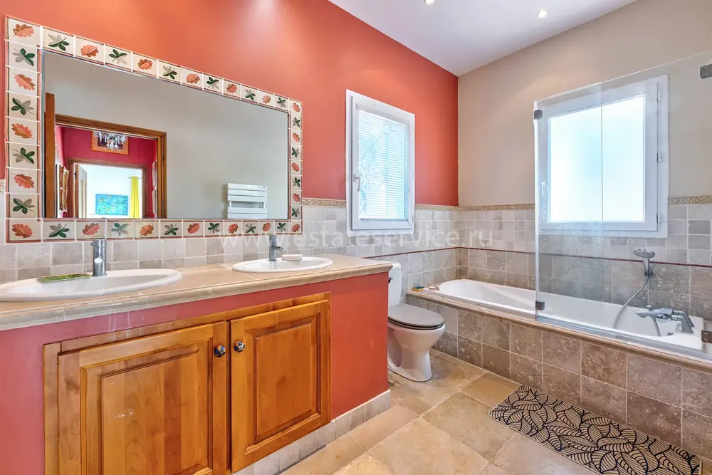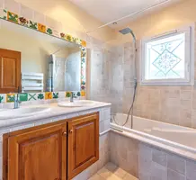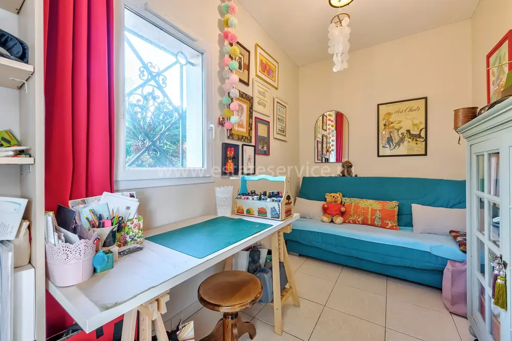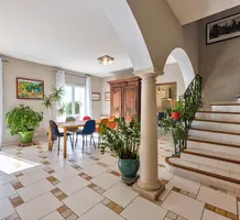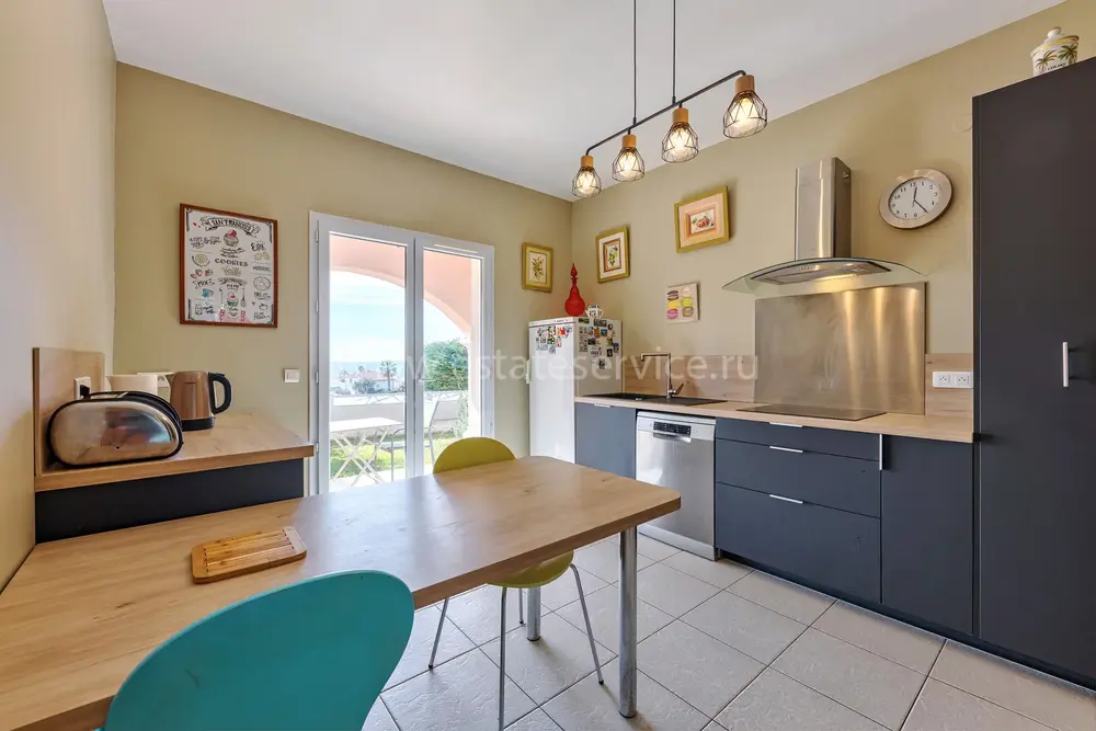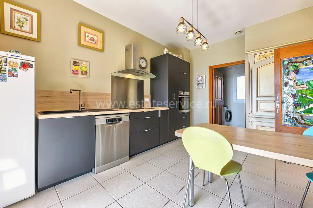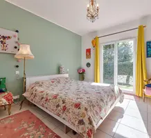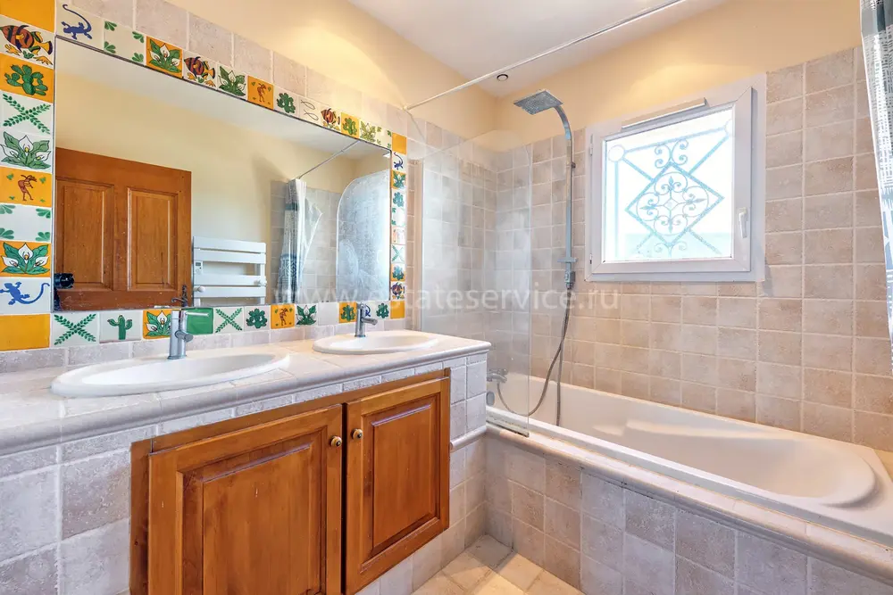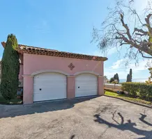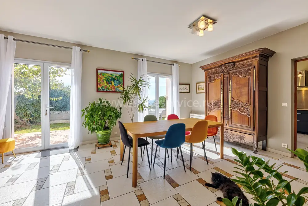 Ухоженная вилла 2005 года постройки в тихом популярном районе Ле-Колетт. Жилая площадь 196 m² + гараж на две машины, на участке 1.020 m² пышный ландшафтный сад, крытое джакузи. На первом этаже прихожая, гостиная, столовая, кухня, спальня, кабинет, ванная комната с туалетом, кладовая и санузел. Наверху - ещё три спальни, одна с балконом, игровая комната, ванная и отдельный туалет. Годовой налог 2.009 €.