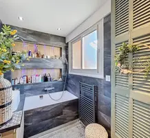 Со вкусом отремонтированная квартира на пятом (предпоследнем) этаже дома с лифтом поблизости от набережной Круазетт и пляжа. Общая площадь 73.2 m² (жилая 62.7 m²) - гостиная 21 m² с террасой 10.4 m², кухня 6.7 m² дополненная лоджией 4.6 m², две спальни 12 и 13 m², главная с ванной комнатой и отдельный туалет. Есть кладовая 8.3 m², можно арендовать паркинг, всё пешком. Коммунальные платежи 137 €, годовой налог 1.118 €.