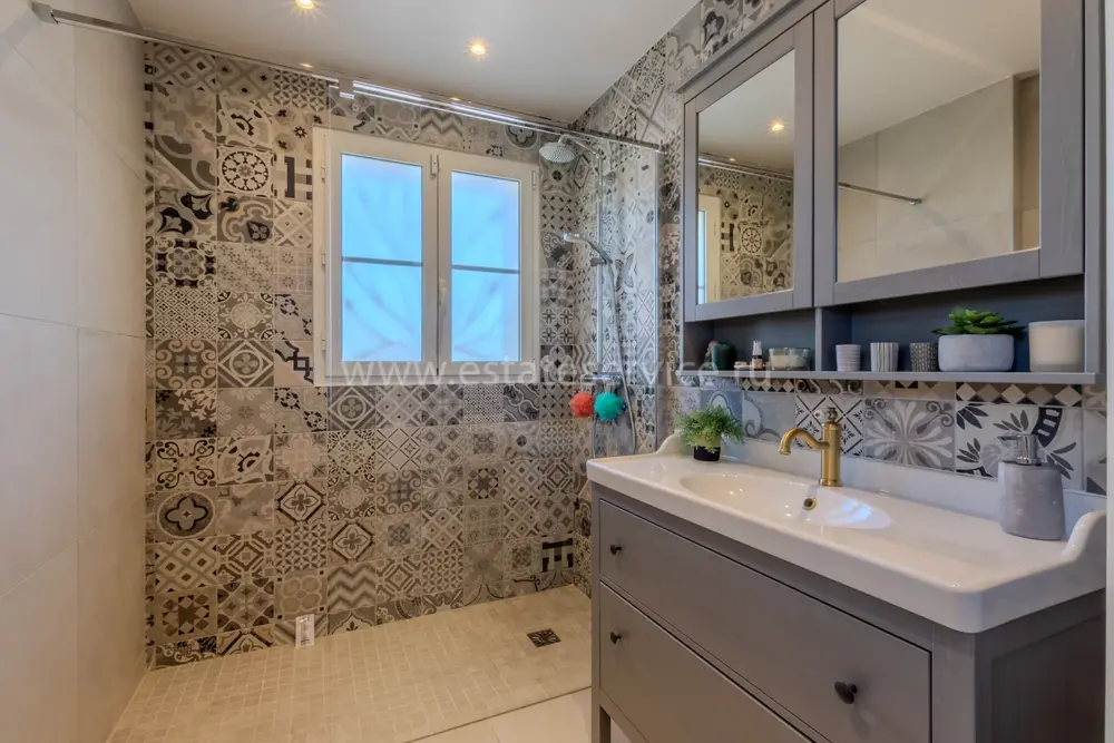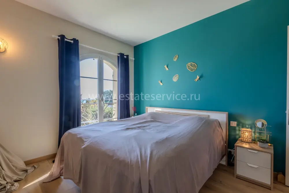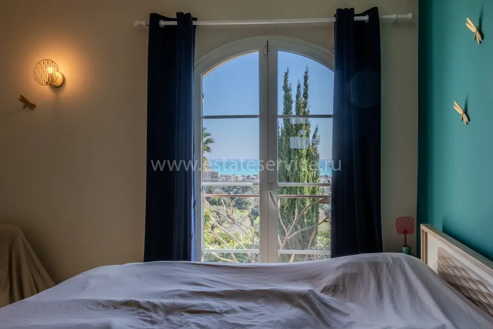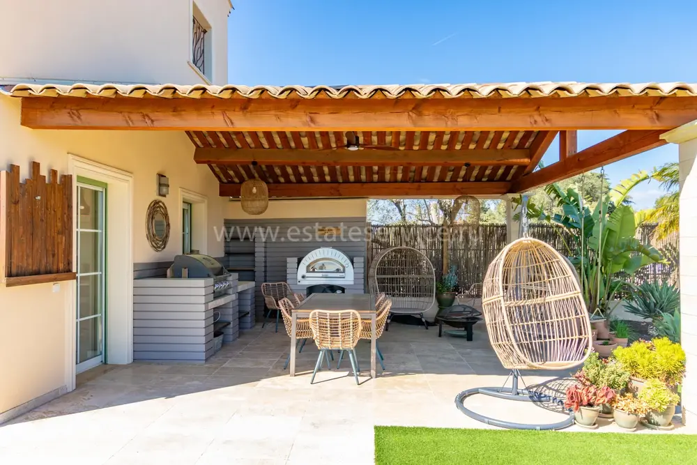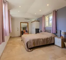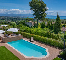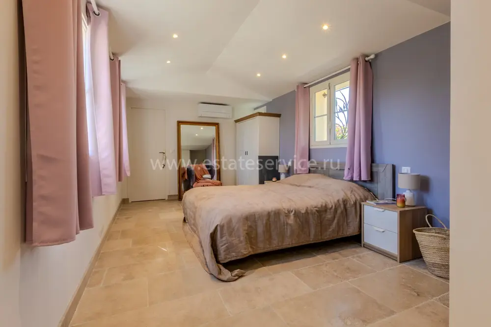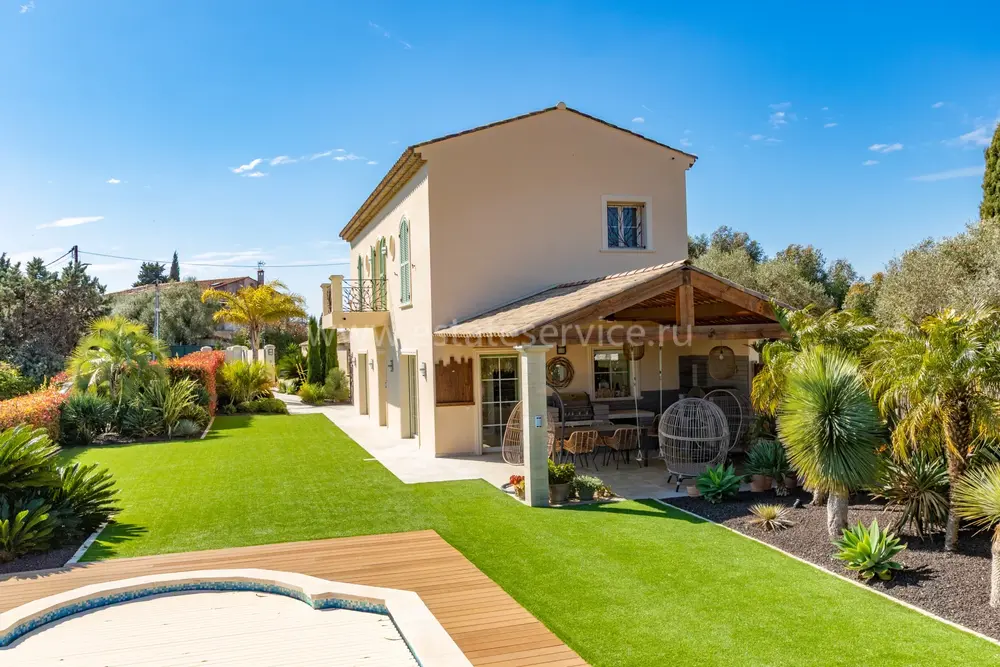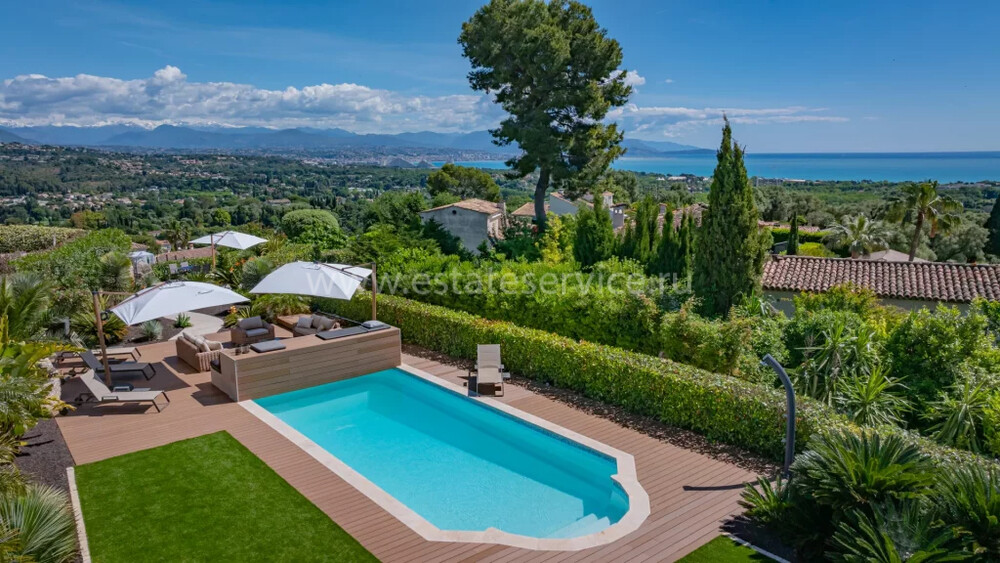 Полностью отремонтированная вилла с тихим и удобным расположением в пяти минутах от моря. Общая площадь дома 200 m², на участке 1.600 m² ухоженный фруктовый сад с автоматическим поливом, видом на море и горы, закрываемый бассейн с подогревом, площадка для игры в петанк, гараж 25 m² и открытая парковка. На первом этаже прихожая с туалетом, просторная гостиная с камином, столовая, отдельная кухня выходящая в сад, большая спальня с гардеробной и ванной комнатой, прачечная со стиральной машиной и сушилкой. Наверху - коридор, ведущий к трем спальням, главная с душевой и панорамной террасой, общая душевая комната, балкон и отдельный туалет. В подвале 30 m² - котельная и две комнаты свободного назначения. Годовой налог 3.190 €.