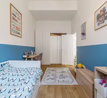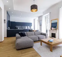 Квартира с дизайнерской отделкой на третьем (3/5) этаже буржуазного здания без лифта. Жилая площадь 96 m² - прихожая, двойная гостиная 40 m² с кухней и балконом, главная спальня 17 m² на внутренний двор со своей душевой и гардеробной, ещё две спальни 10.1 и 11.7 m², общая ванная комната и отдельный туалет. Качественные материалы, высокие потолки, большие окна, центральный кондиционер, камины, прилагается большая кладовая 15 m², можно арендовать паркинг. Коммунальные платежи 110 €, годовой налог 1.664 €.