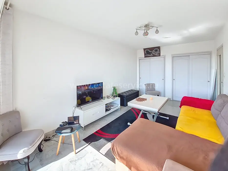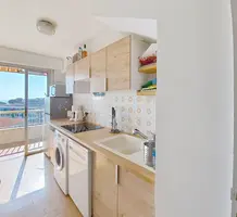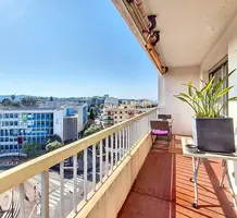Апартаменты на 8-м (предпоследнем) этаже дома с лифтом в пешей доступности от магазинов и пляжей. Общая площадь 56.4 m² (жилая 44 m²) - прихожая 4.4 m², гостиная 19 m², отдельная кухня 5.8 m² и спальня 9.7 m² выходят на террасу 12.4 m² с морским видом, ванная комната и отдельный туалет. В настоящее время (до февраля 26 года) квартира арендована, продаётся с кладовой и парковкой на цокольном этаже. Коммунальные платежи 170 €, годовой налог 951 €.