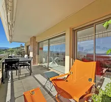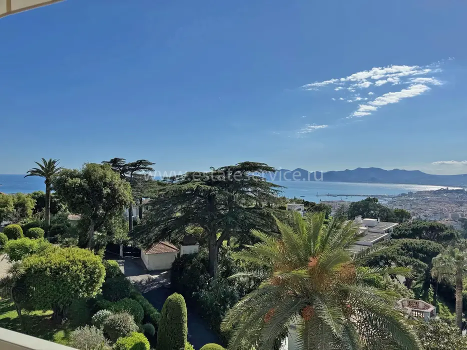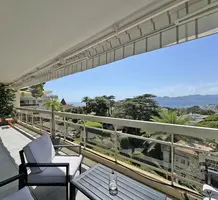 Апартаменты на 3-м (предпоследнем) этаже резиденции с парком и видеонаблюдением. Общая площадь 116.8 m² (жилая 83.7 m²) - прихожая, гостиная 29.5 m² и главная спальня-сьют 13.5 m² выходят на первую террасу 23.1 m², отдельная кухня 7.6 m² и вторая спальня 12.9 m² на вторую террасу 9.9 m², общая (вторая) душевая и отдельный туалет. Обе террасы с видом на море, горы Esterel и крышу знаменитого отеля Carlton, включены гараж, частное парковочное место и большая кладовая. Коммунальные платежи 383 €, годовой налог 1.730 €.