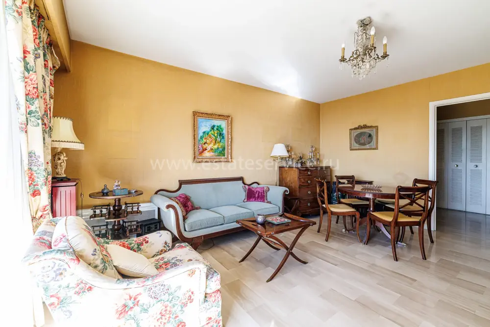 Апартаменты на пятом этаже (5/6) закрытого кондоминиума с парком возле моря и основных удобств. Общая площадь 73 m² (жилая 60 m²) - прихожая 8.3 m² с гардеробной, гостиная 21.3 m² и кухня 8 m² выходят на панорамную террасу 12 m², спальня 13.5 m² с встроенным шкафом и балконом 2.9 m² - вид на зелень, ванная комната 4.8 m² и отдельный туалет. Требуется некоторое обновление, включены кладовая и частное парковочное место 14 m², все удобства пешком. Коммунальные платежи 144 €, годовой налог 1.200 €.