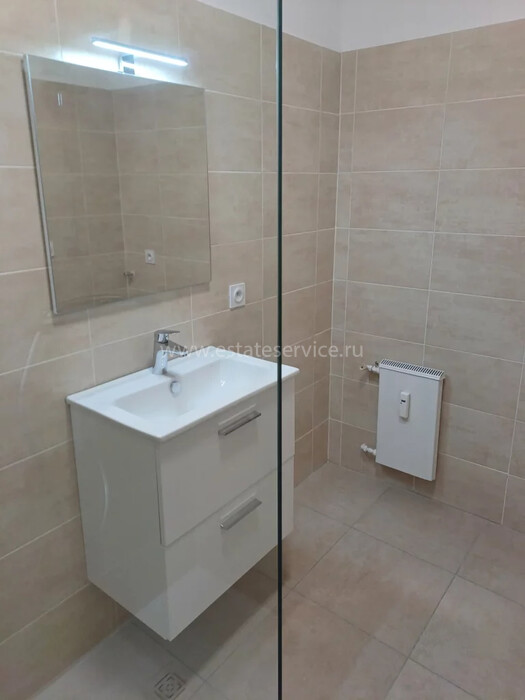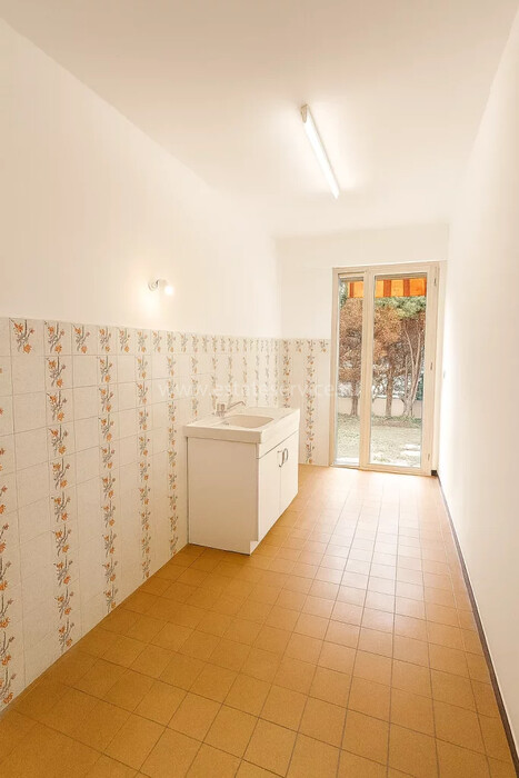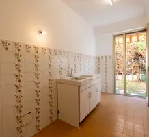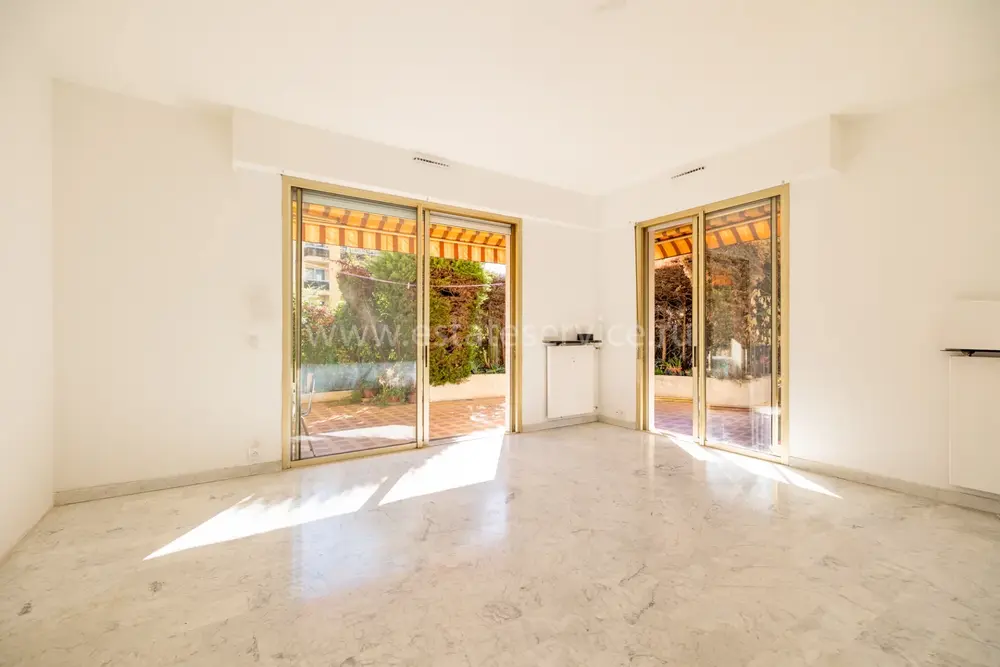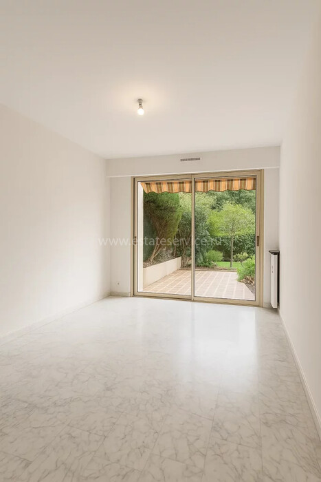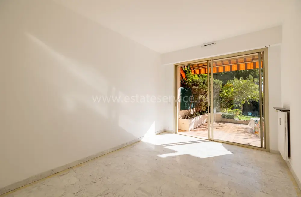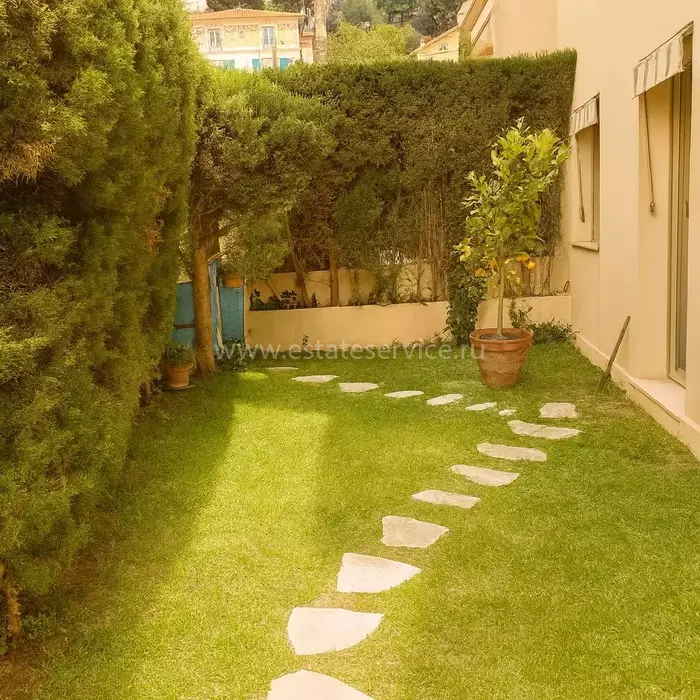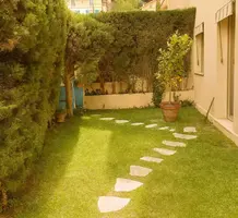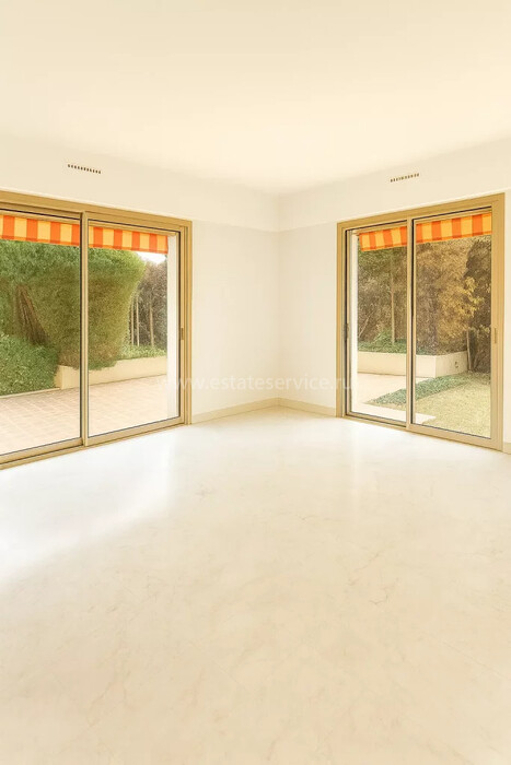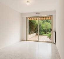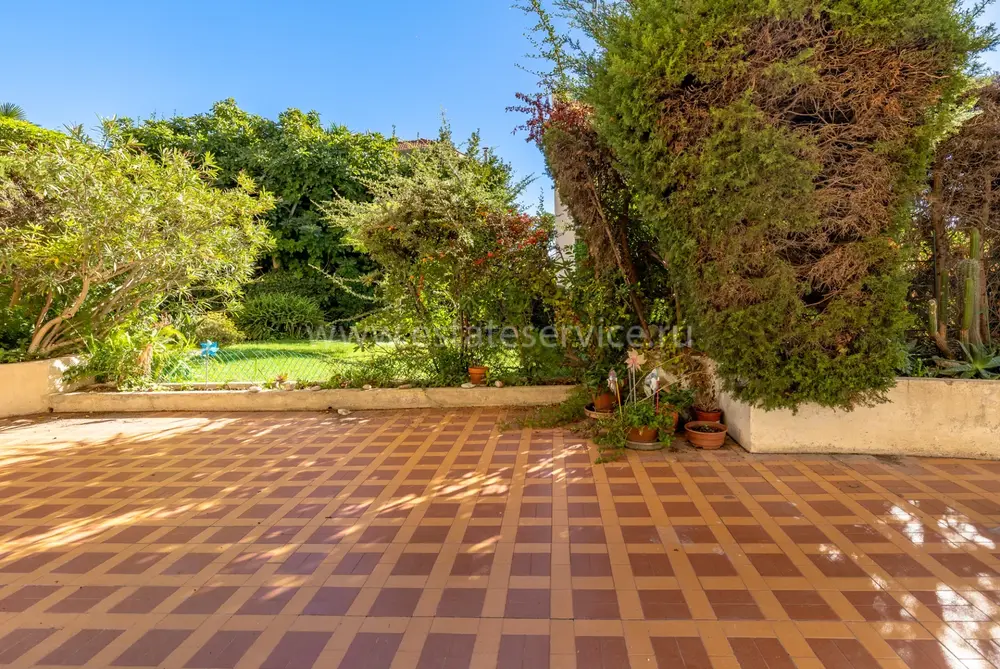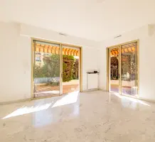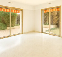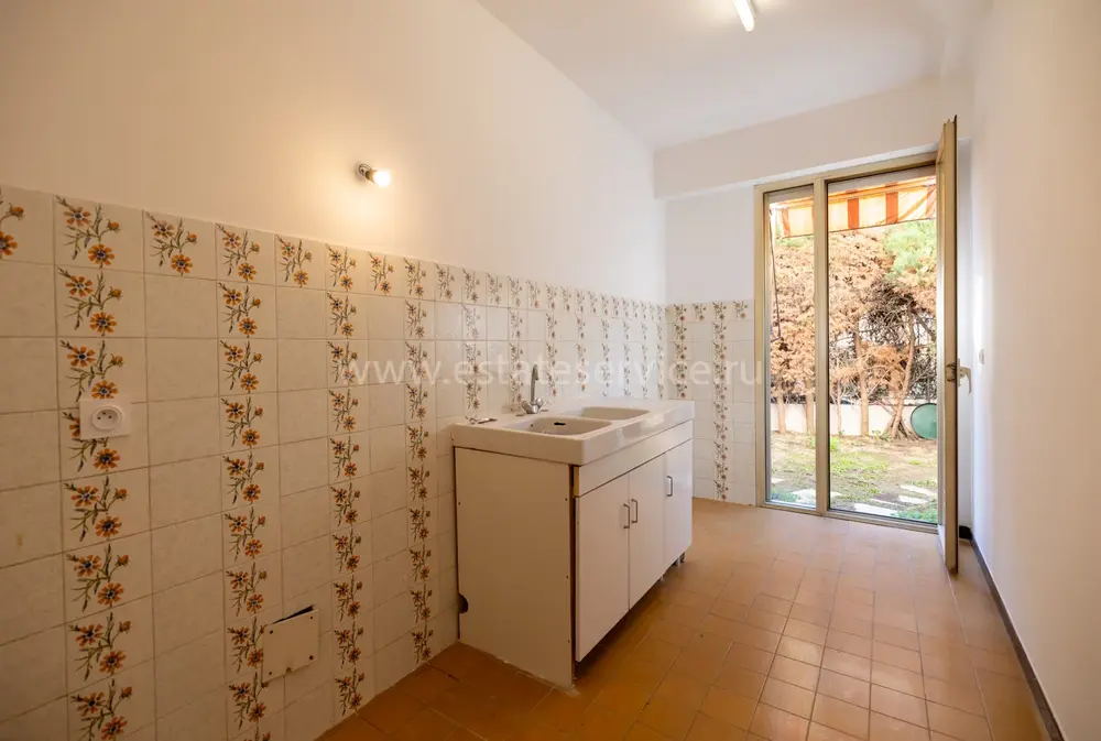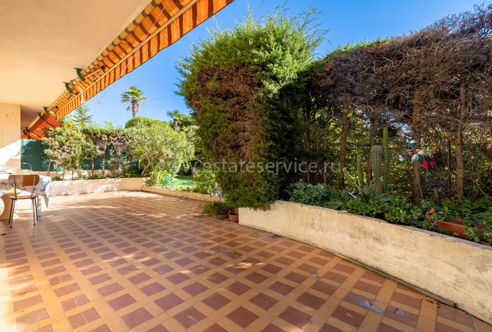 Квартира под обновление на первом этаже элитной резиденции недалеко от центра и моря. Жилая площадь 68 m² - прихожая 9.4 m² с гардеробной, гостиная 19.4 m² и отдельная кухня 8.1 m² с выходом на солнечную террасу-сад 40 m², две спальни 12.3 и 12.8 m² с гардеробными, ванная комната и отдельный туалет. Хороший потенциал, кладовая 3.8 m², в цену включён закрытый гараж 12.3 m². Коммунальные платежи 300 €.