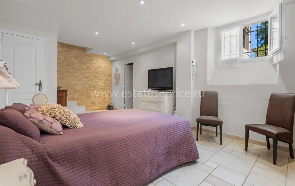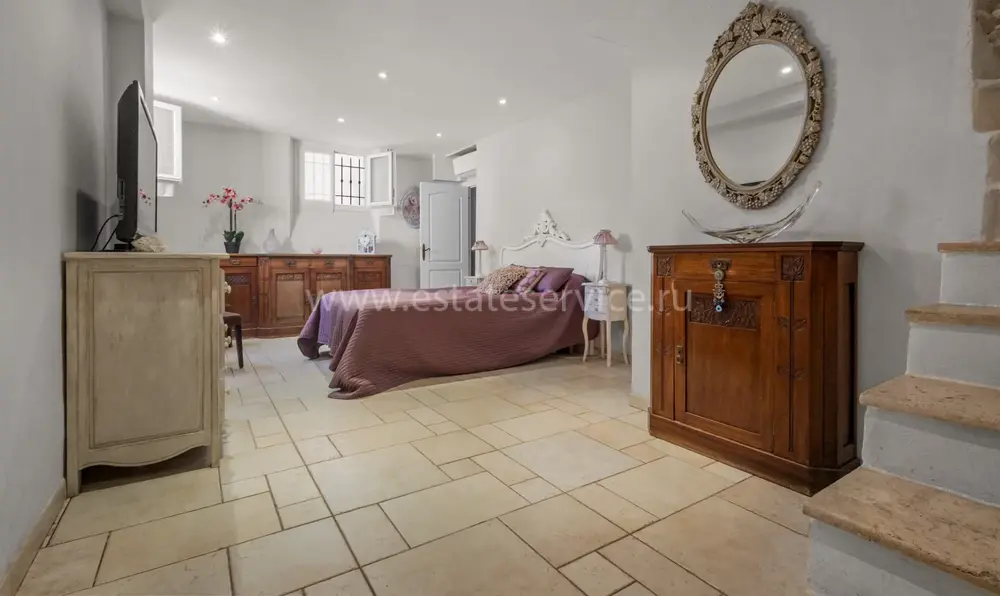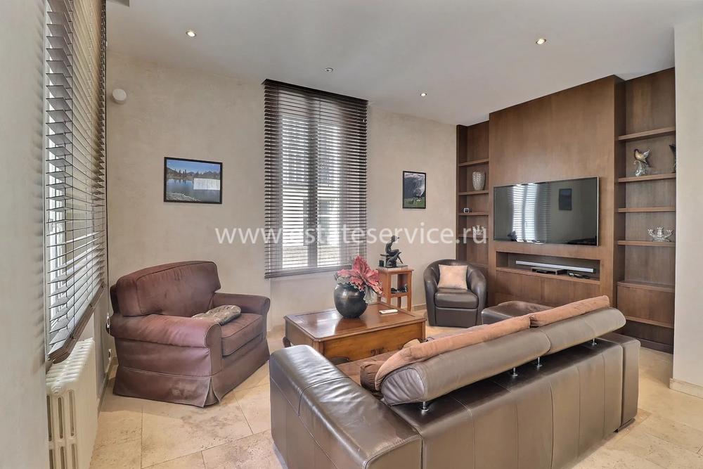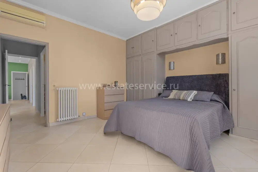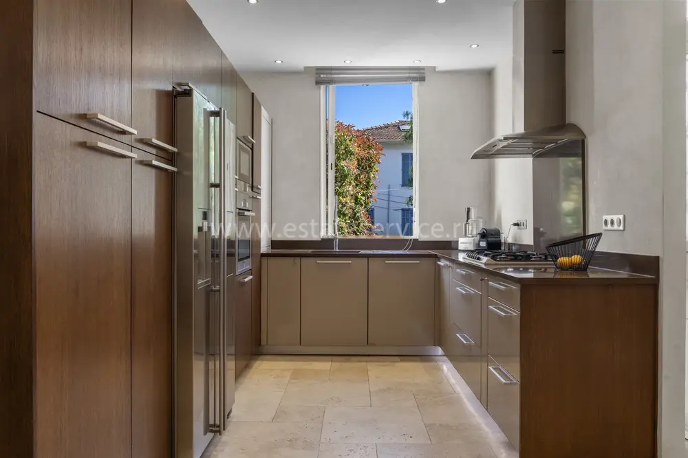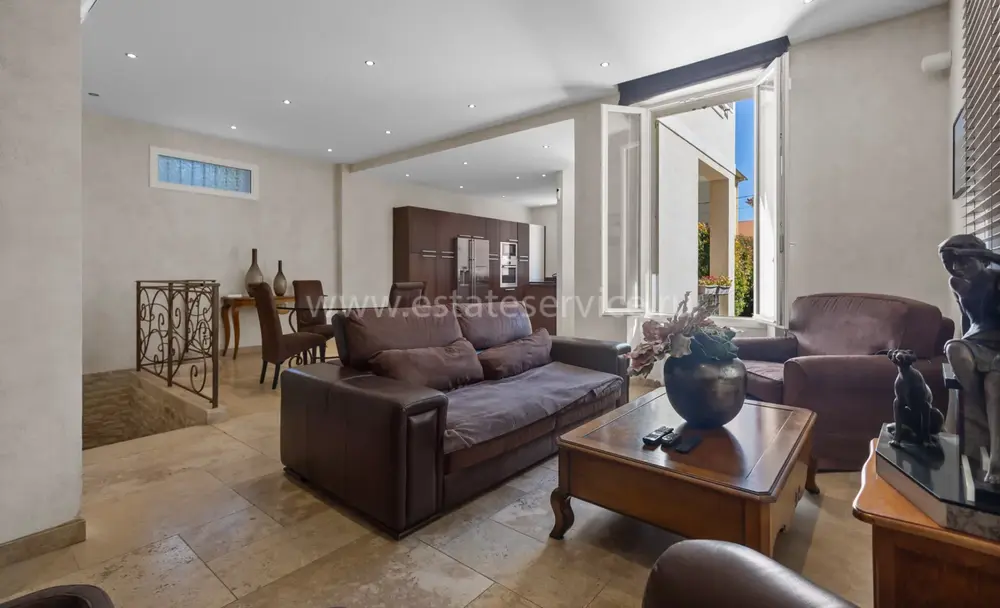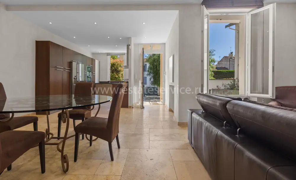 Элегантная вилла в пешей доступности от центра Канн. Общая площадь 230 m² (жилая 205 m²) разделена на две отдельные части, на ровном участке 888 m² аккуратный сад, есть место под бассейн, большой навес для автомобиля, пристройка 25 m² с подсобкой/котельной в задней части дома. Первая квартира (около 125 m², занимает первый этаж и мезонин) - гостиная 43.3 m² с открытой кухней, три спальни 14, 15.2 и 16 m², ванная, душевая и комната 26 m² под спорт-зал или гардеробную. Вторая часть 77 m² разместилась наверху - двойная гостиная-столовая 30.7 m², отдельная кухня 10.4 m², спальня 7.5 m², кабинет 20 m² и душевая с туалетом. Годовой налог на имущество 2.500 €.