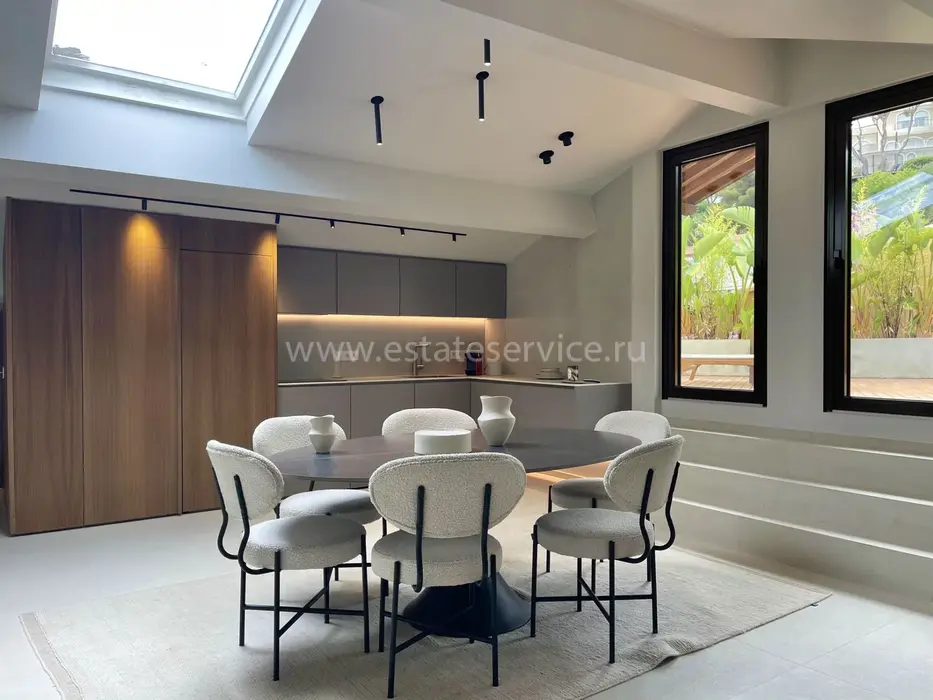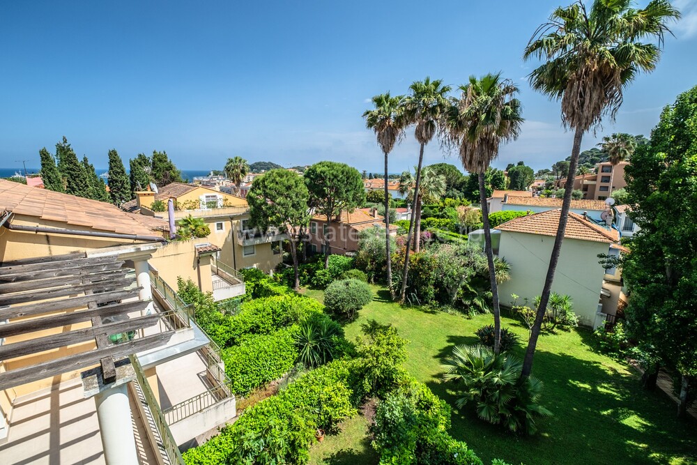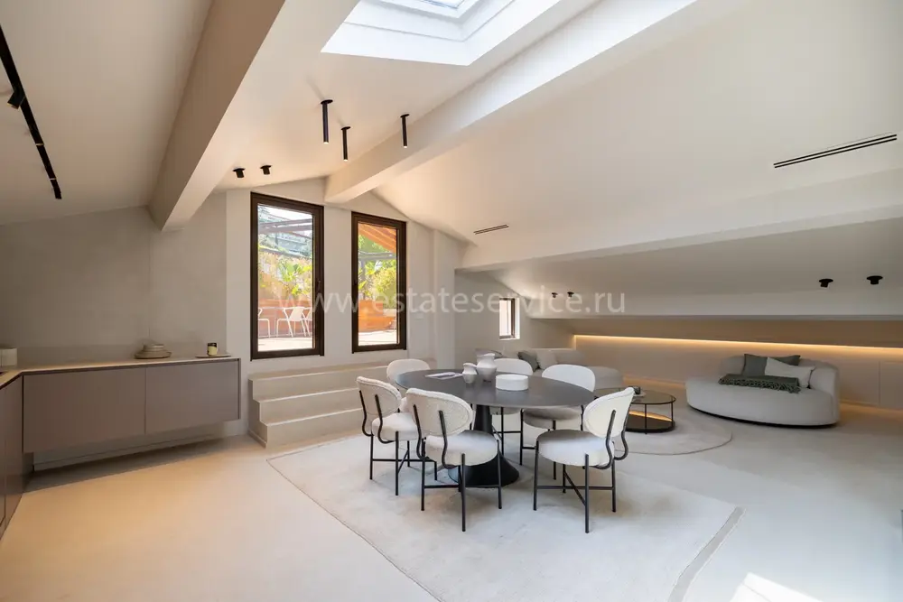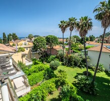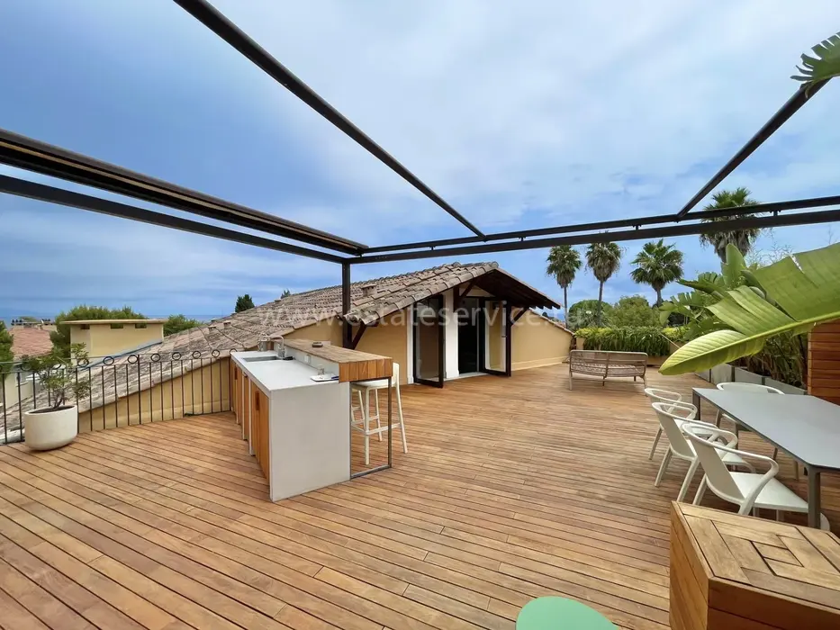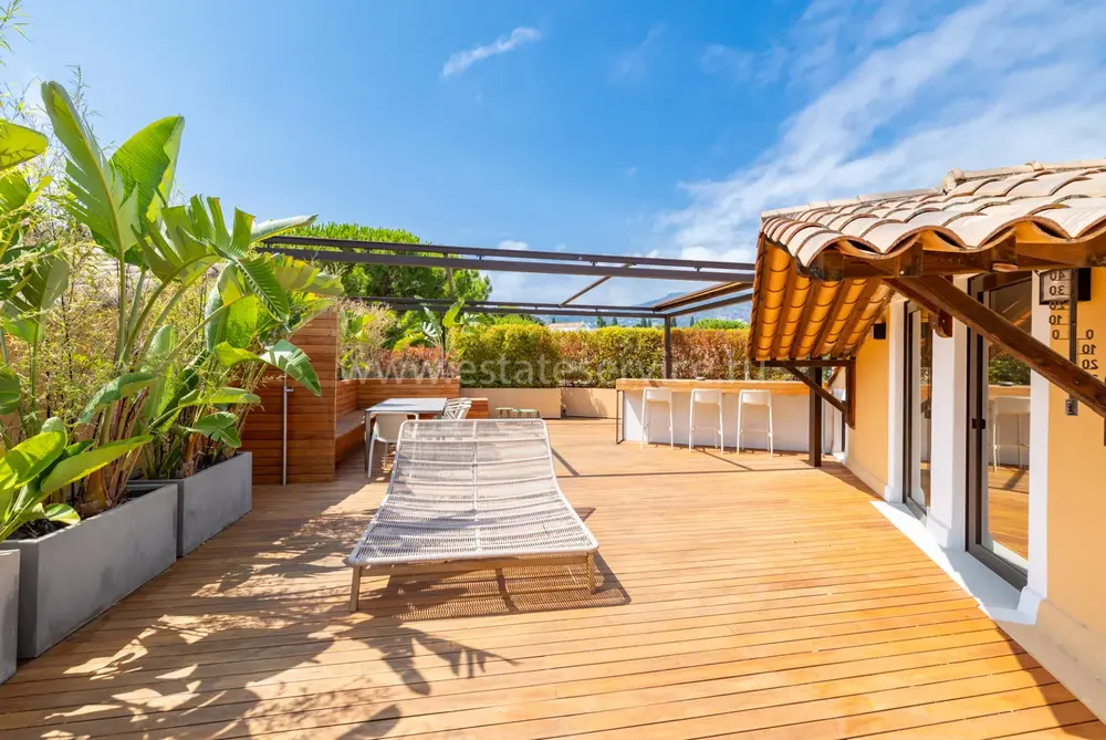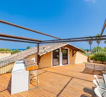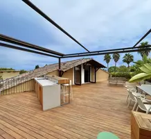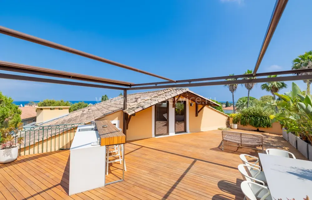 Двухуровневая квартира на верхнем (3-м) этаже безопасной резиденции с лифтом в трёх минутах ходьбы от центра, пляжа и магазинов. Общая площадь 200 m² (жилая 101 m²) - прихожая 8.9 m², тройная гостиная 34.9 m² с открытой кухней и шикарной террасой 77 m² - вид на море, летняя кухня, душ, несколько зон отдыха с элегантной перголой, ниже разместились главная спальня 16.3 m² с ванной комнатой (ванна и душ), отдельным туалетом и гардеробной, ещё две спальни 13.8 и 14.8 m², каждая со своей душевой, общей террасой 11 m² и балконом 5 m², а также прачечная 7 m². Качественная отделка, включены кладовая и закрытый гараж с лёгким доступом на лифте. Коммунальные платежи за квартал 1.168 € , годовой налог 1.800 €.
