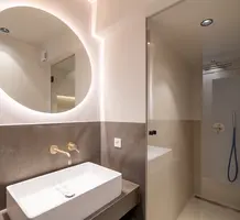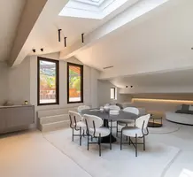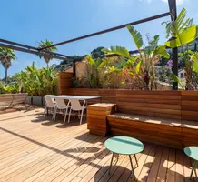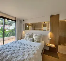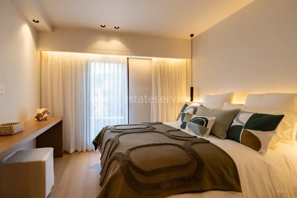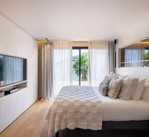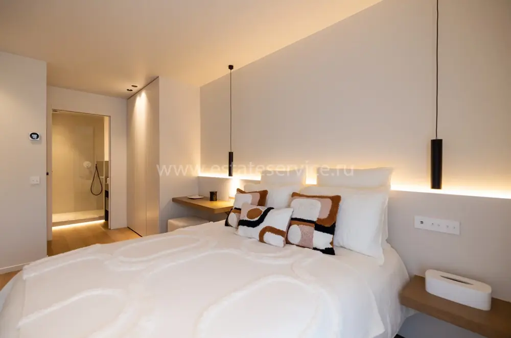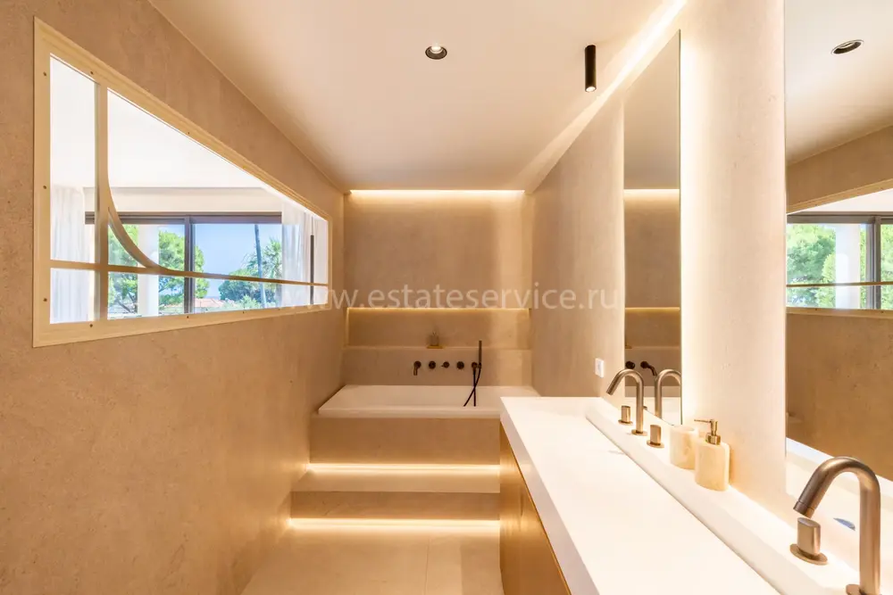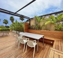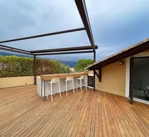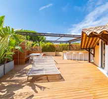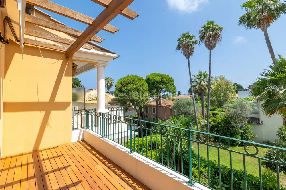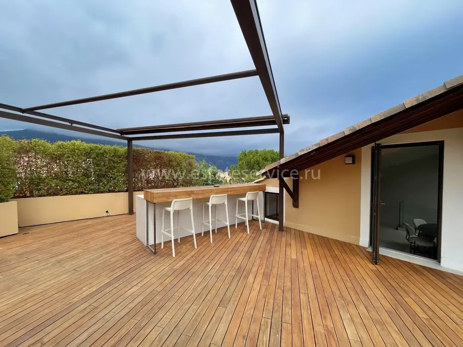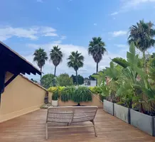 Двухуровневая квартира на верхнем (3-м) этаже безопасной резиденции с лифтом в трёх минутах ходьбы от центра, пляжа и магазинов. Общая площадь 200 m² (жилая 101 m²) - прихожая 8.9 m², тройная гостиная 34.9 m² с открытой кухней и шикарной террасой 77 m² - вид на море, летняя кухня, душ, несколько зон отдыха с элегантной перголой, ниже разместились главная спальня 16.3 m² с ванной комнатой (ванна и душ), отдельным туалетом и гардеробной, ещё две спальни 13.8 и 14.8 m², каждая со своей душевой, общей террасой 11 m² и балконом 5 m², а также прачечная 7 m². Качественная отделка, включены кладовая и закрытый гараж с лёгким доступом на лифте. Коммунальные платежи за квартал 1.168 € , годовой налог 1.800 €.